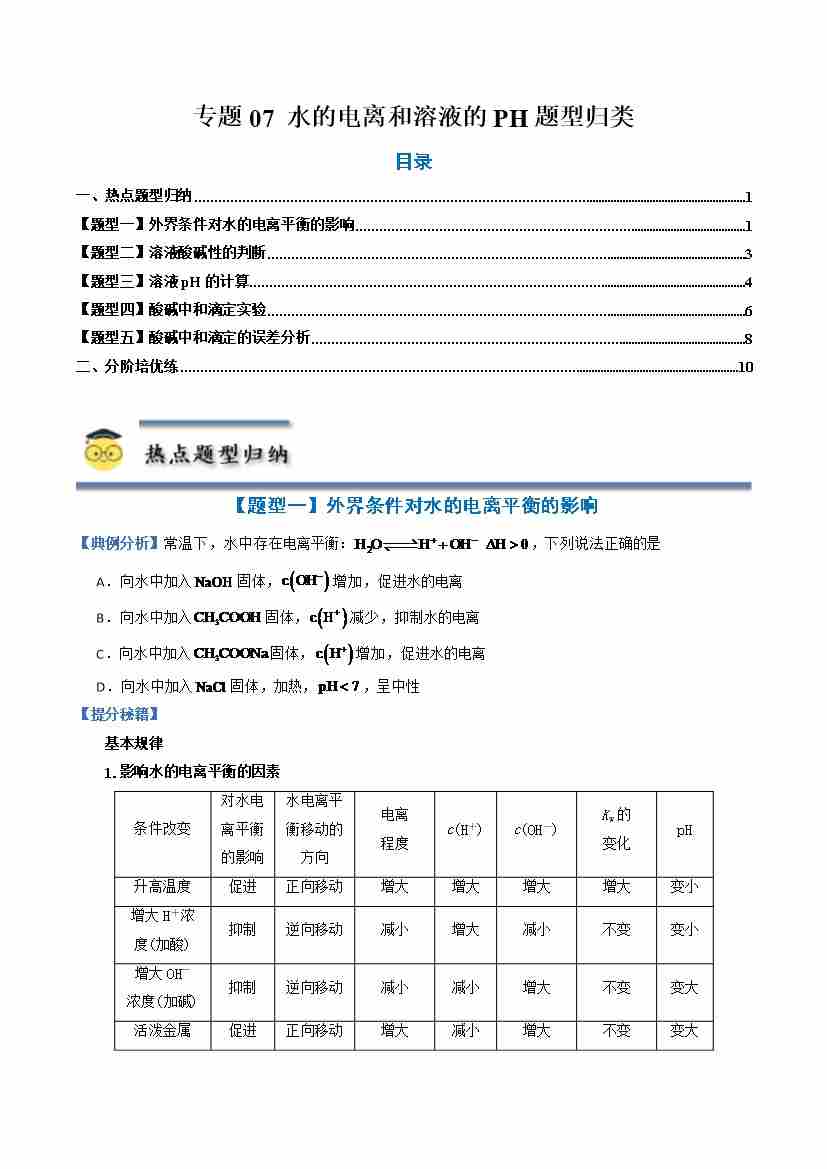 专题07 水的电离和溶液的PH--(人教版2019选择性必修1)(学生版)