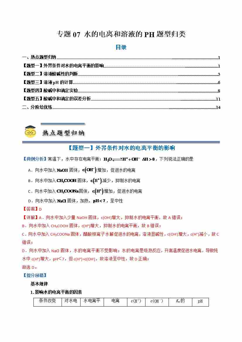 专题07 水的电离和溶液的PH--(人教版2019选择性必修1)(教师版)