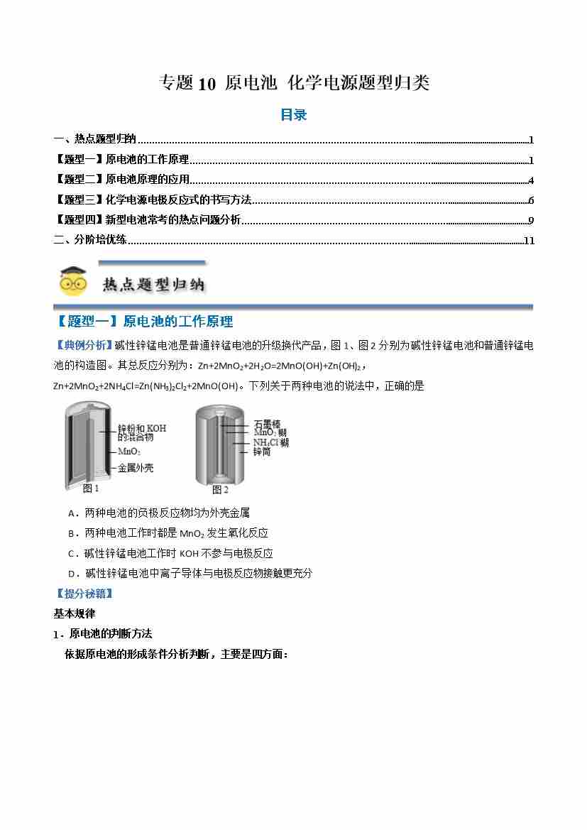 专题10 原电池 化学电源--(人教版2019选择性必修1)(学生版)