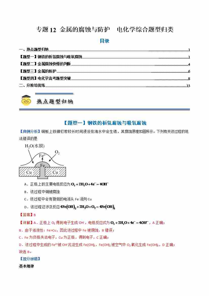 专题12 金属的腐蚀与防护-(人教版2019选择性必修1)(教师版)