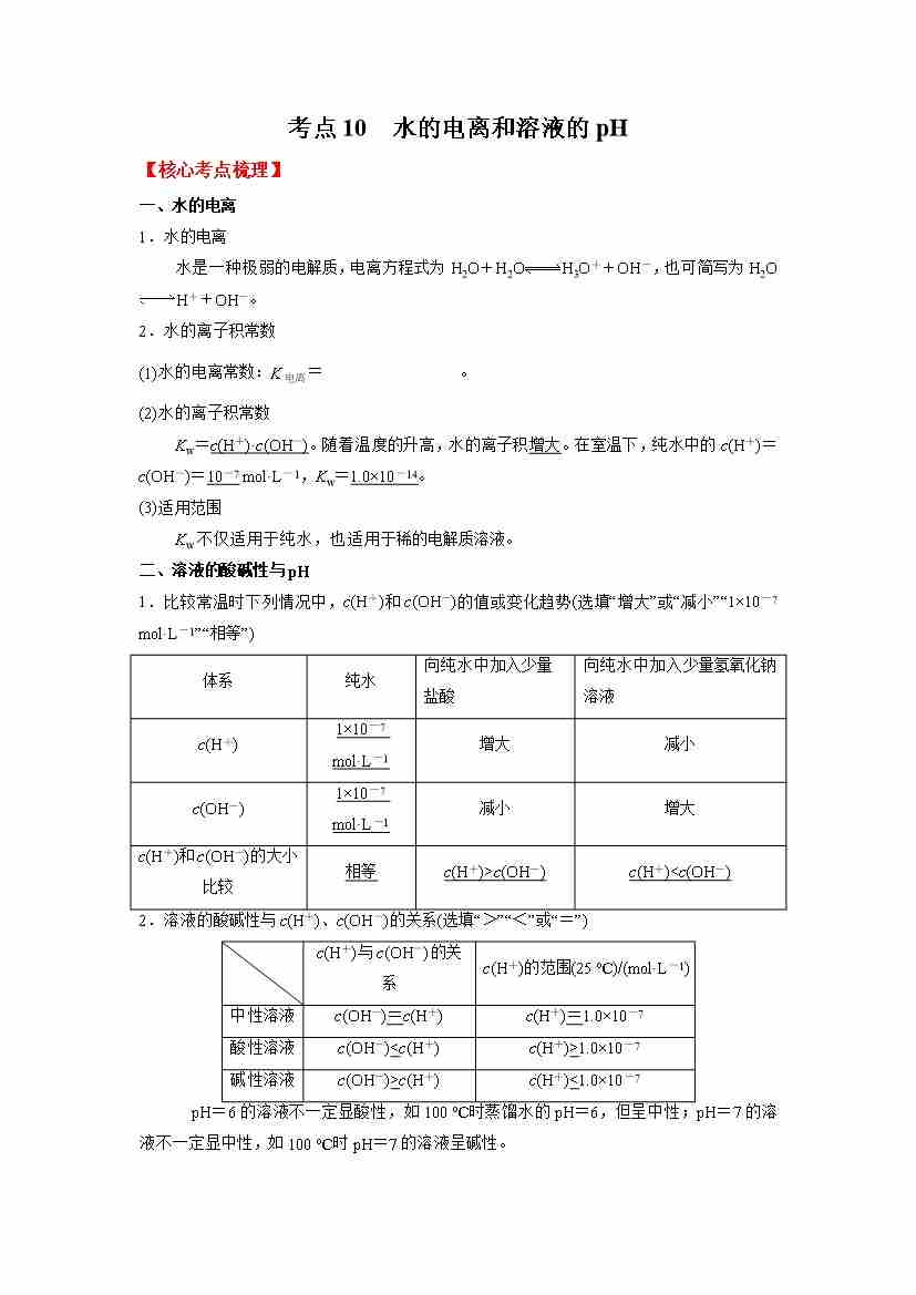 考点10 水的电离和溶液的pH-(学生版)