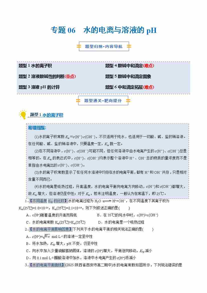 专题06 水的电离与溶液的pH(期中专项训练)(原卷版)