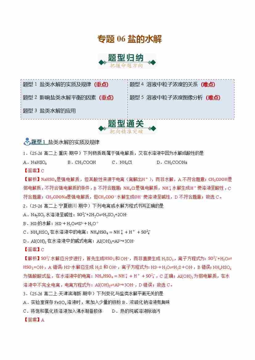 专题06 盐的水解(期末复习专项训练)(学生版)