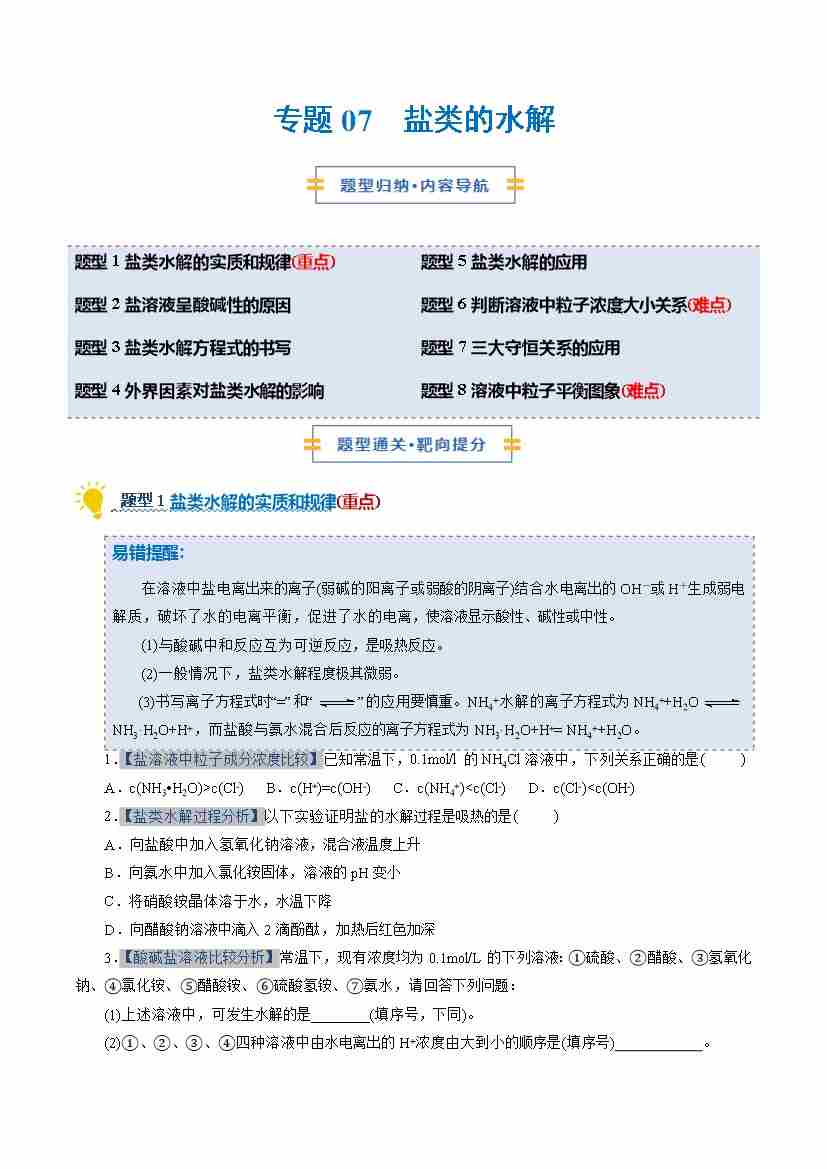 专题07 盐类的水解(期中专项训练)(原卷版)