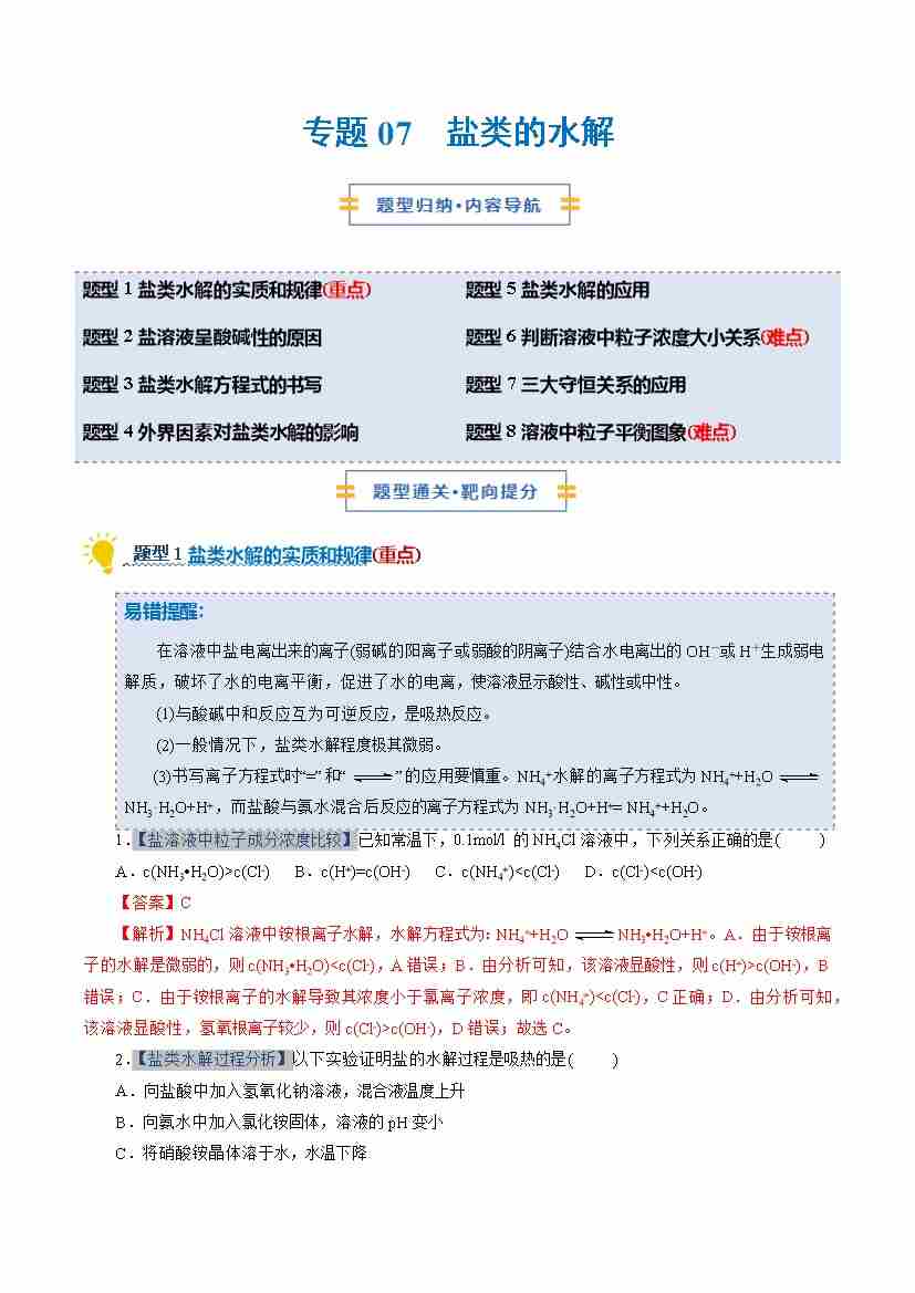专题07 盐类的水解(期中专项训练)(解析版)