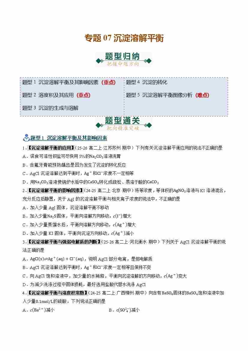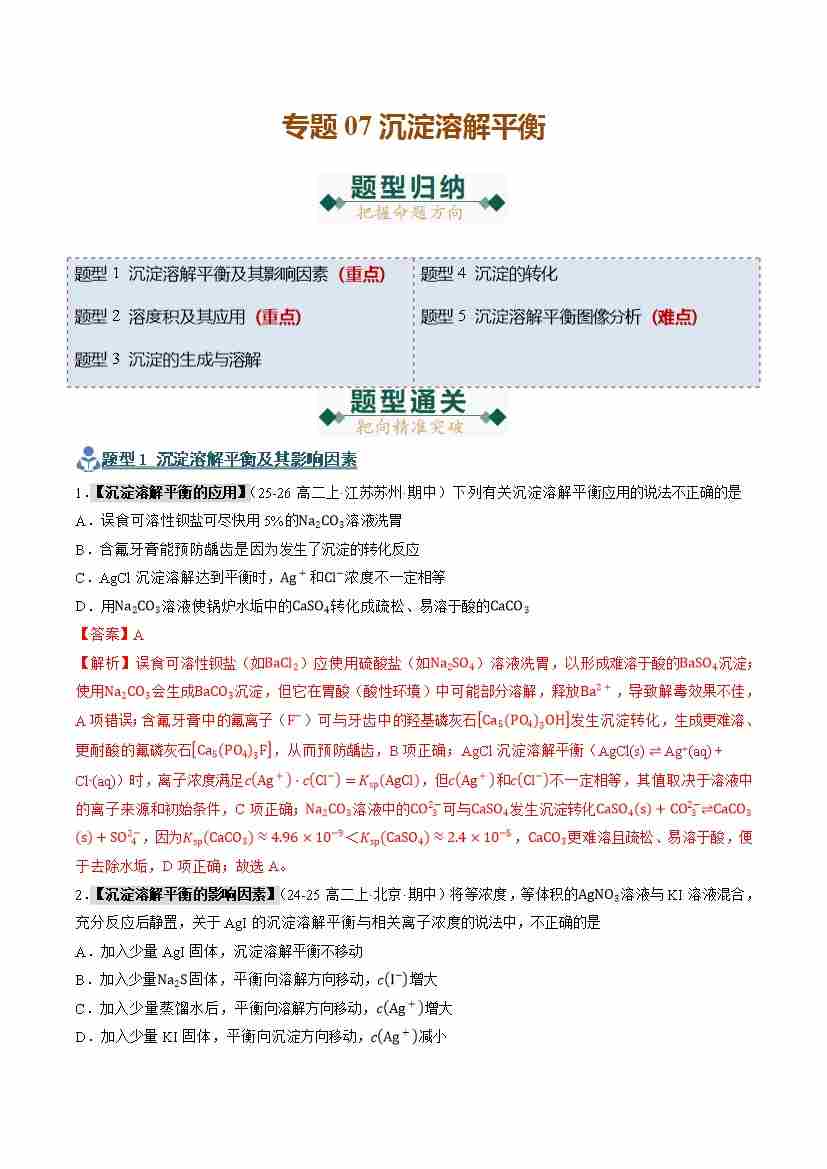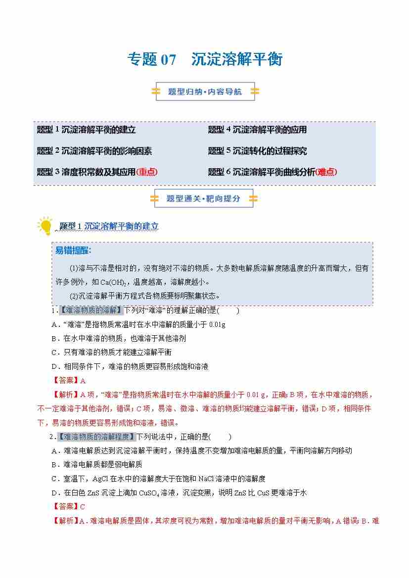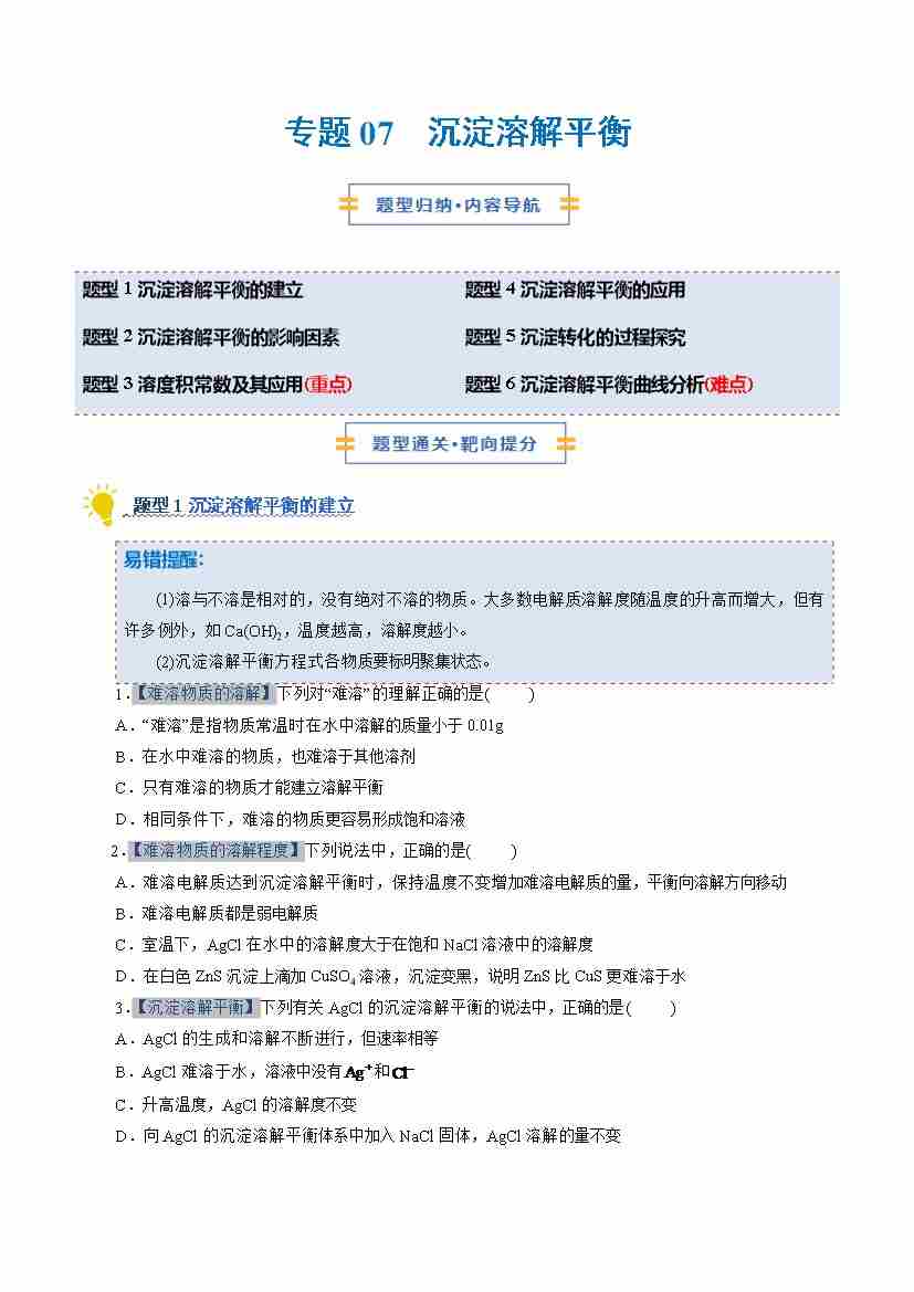 专题07 沉淀溶解平衡(期末复习专项训练)(学生版)