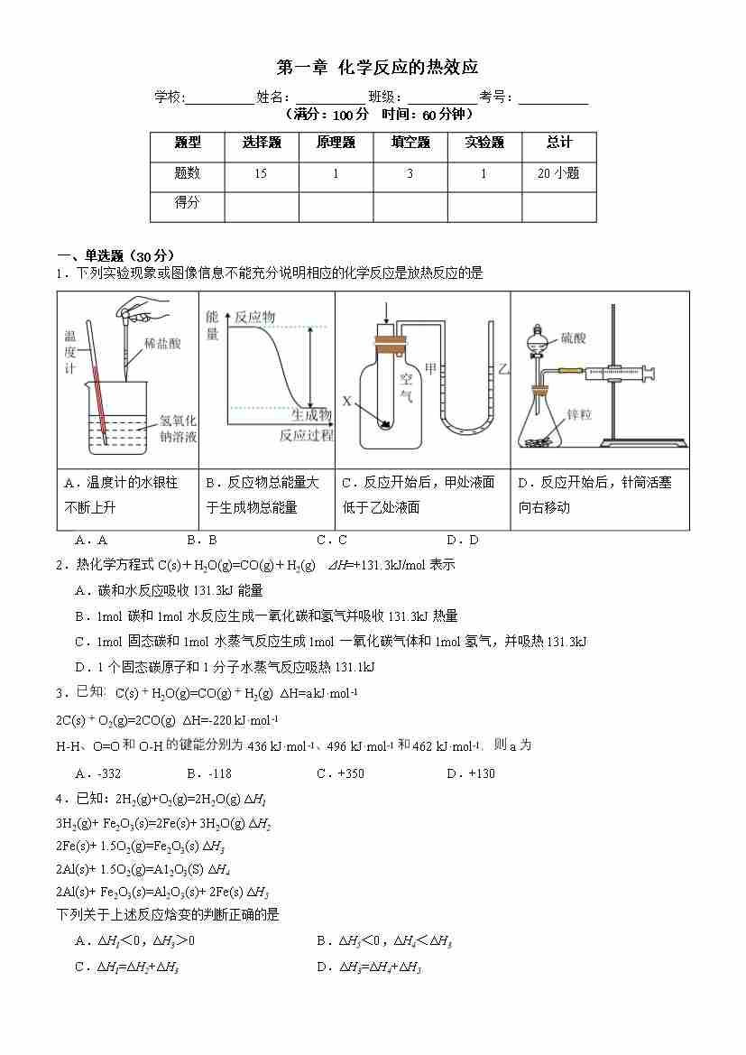 第一章 化学反应的热效应(单元检测)(原卷版)(人教版2019选择性必修1)