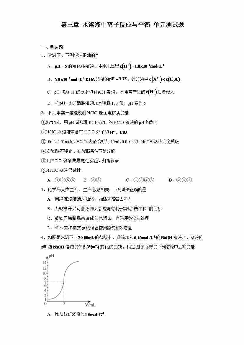 第三章水溶液中离子反应与平衡 单元测试题---(2019)选择性必修1