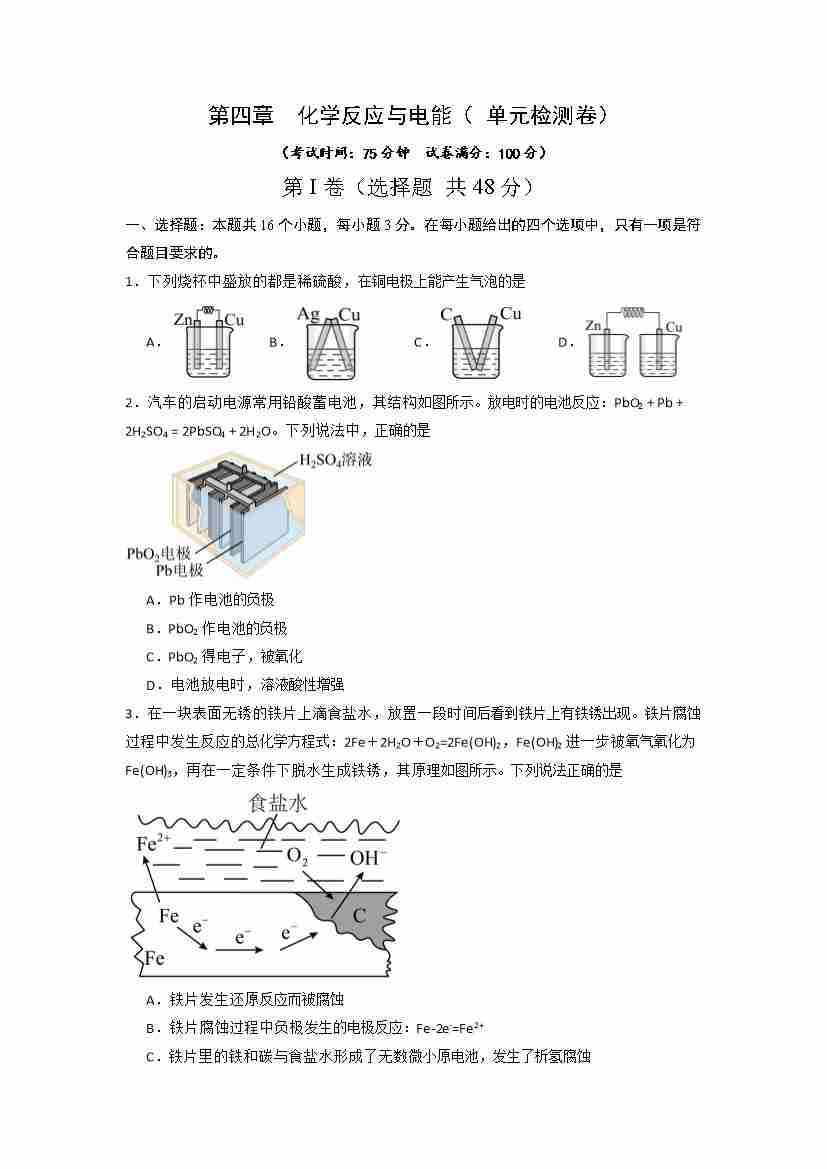 第四章 化学反应与电能( 单元检测卷)-人教版2019选择性必修1)(原卷版)