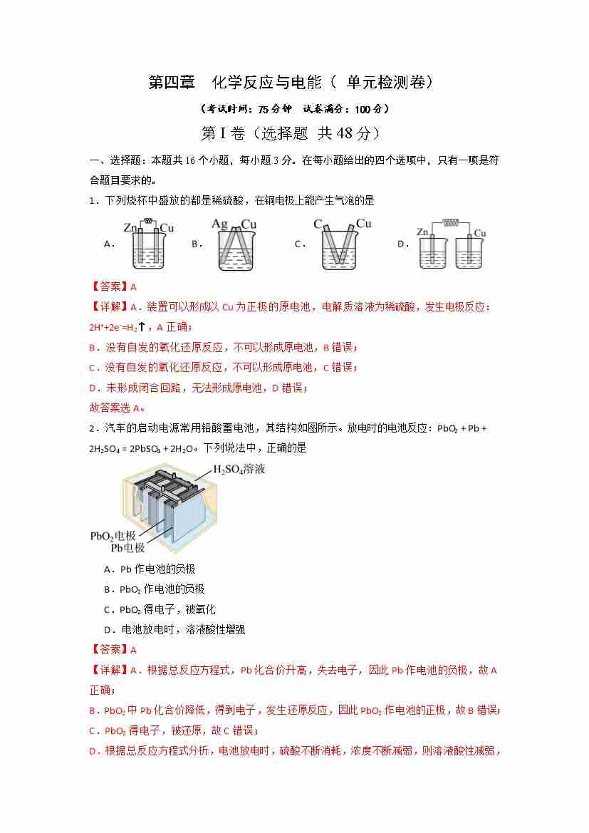 第四章 化学反应与电能( 单元检测卷)-(人教版2019选择性必修1)(解析版)