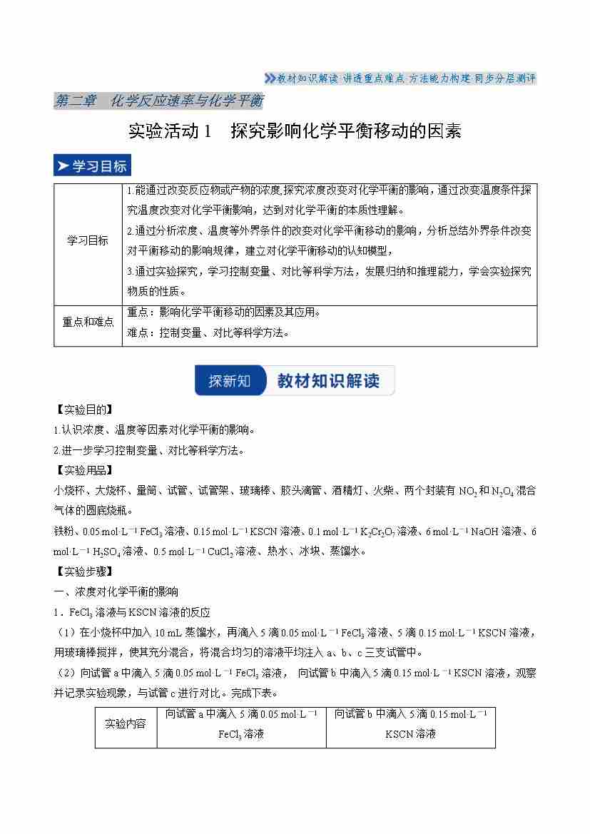 实验活动1 探究影响化学平衡移动的因素(学生版)