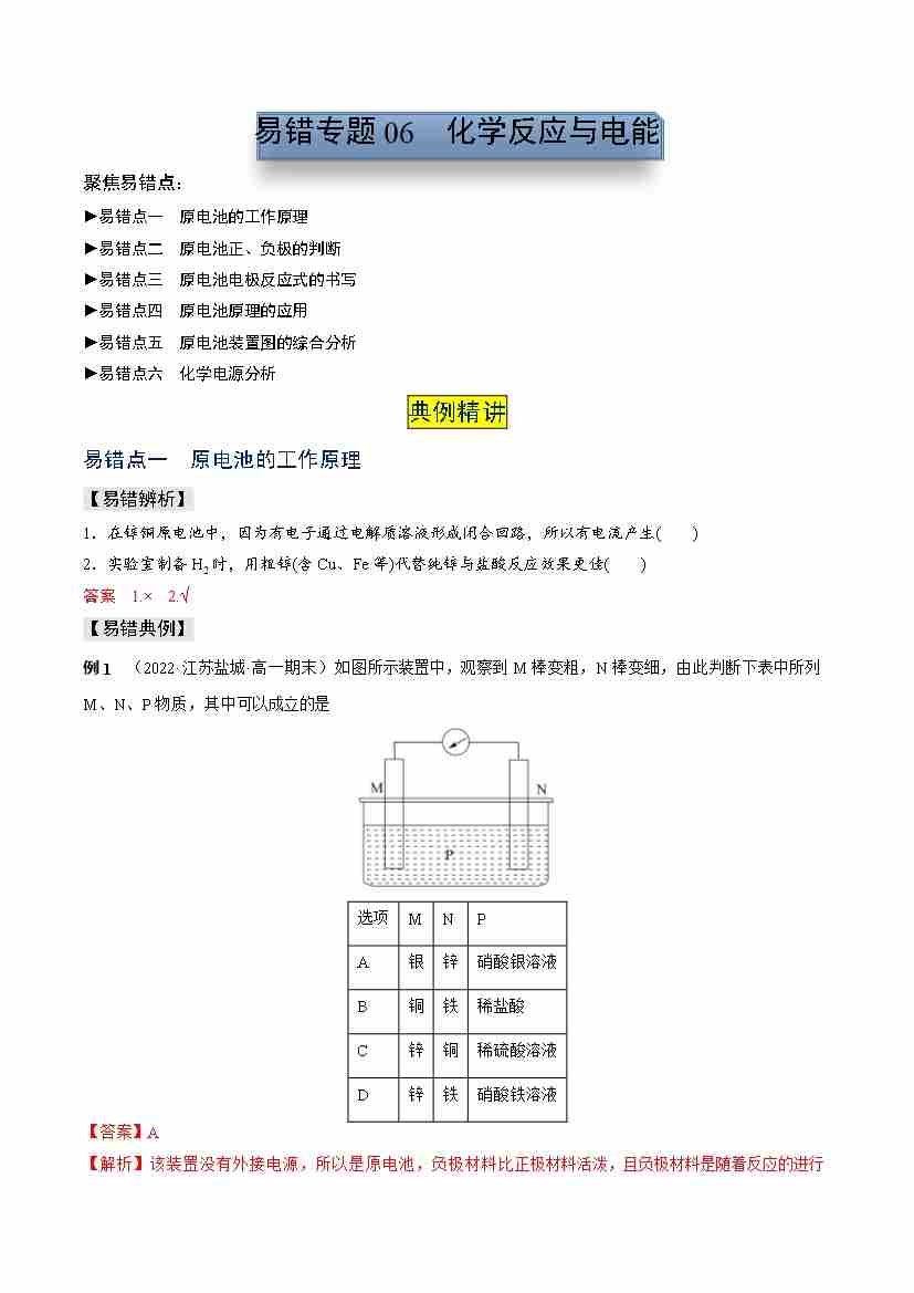 易错专题06 化学反应与电能(学生版)