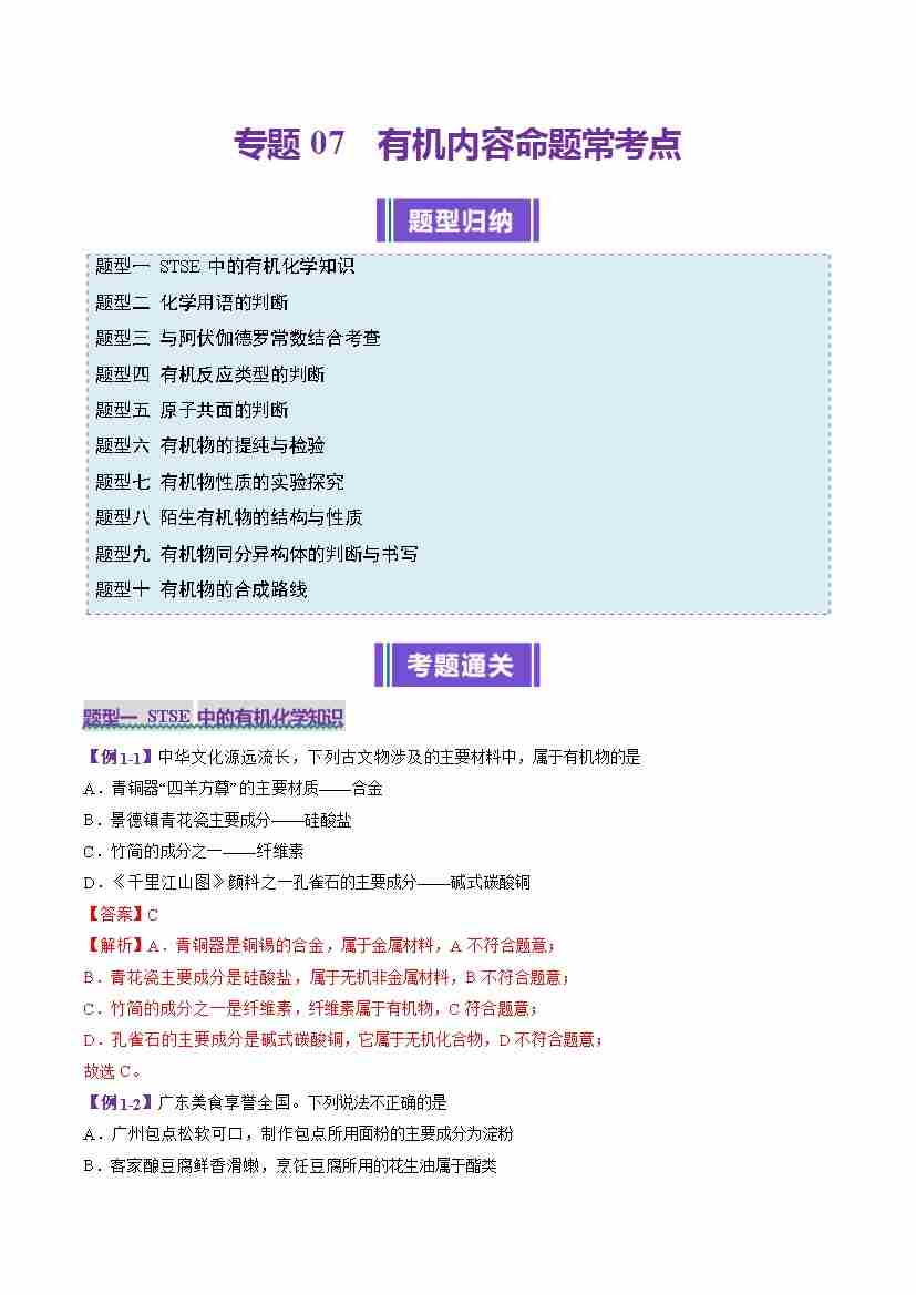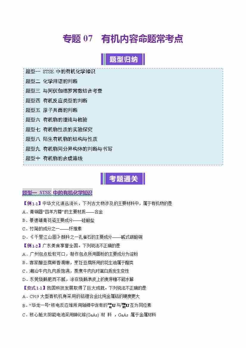 专题07 有机内容命题常考点(考题猜想)(10大题型)(教师版)
