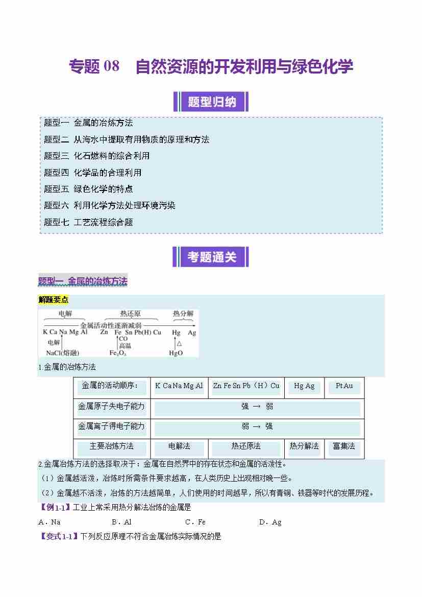 专题08 自然资源的开发利用与绿色化学(考题猜想)(7大题型)(学生版)