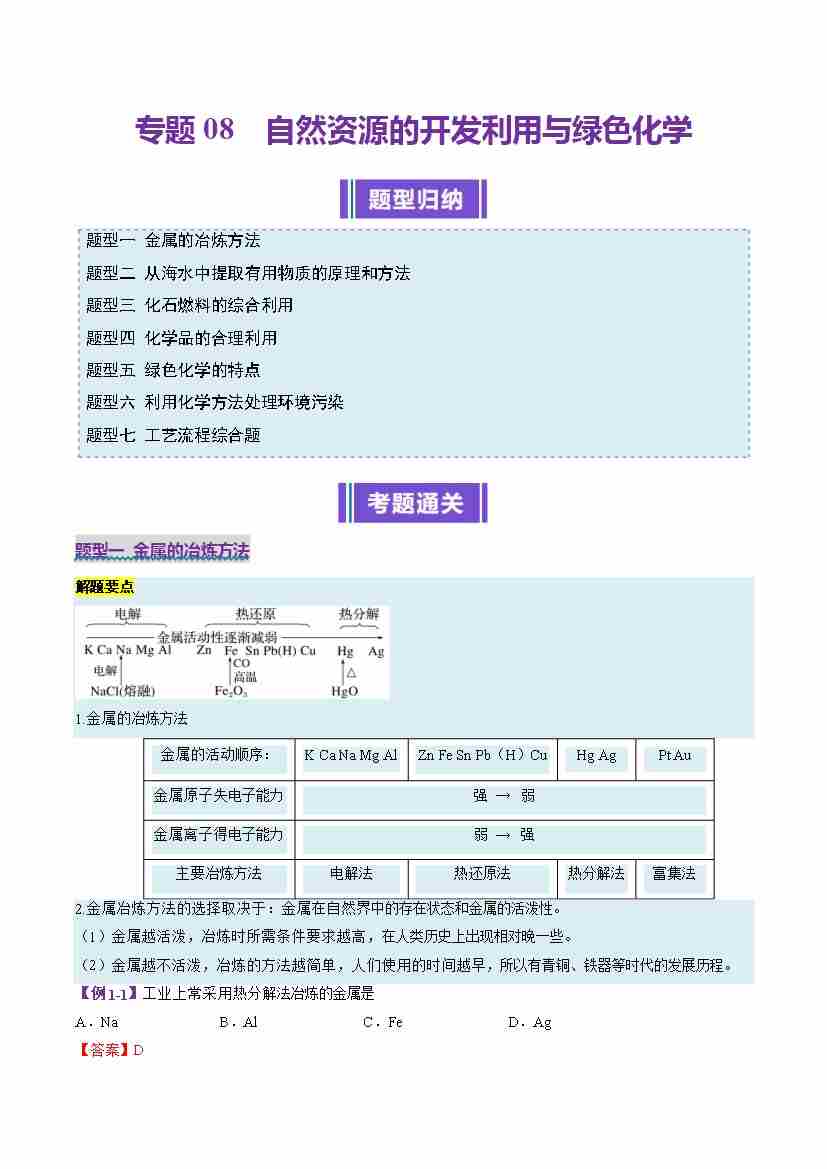 专题08 自然资源的开发利用与绿色化学(考题猜想)(7大题型)(教师版)