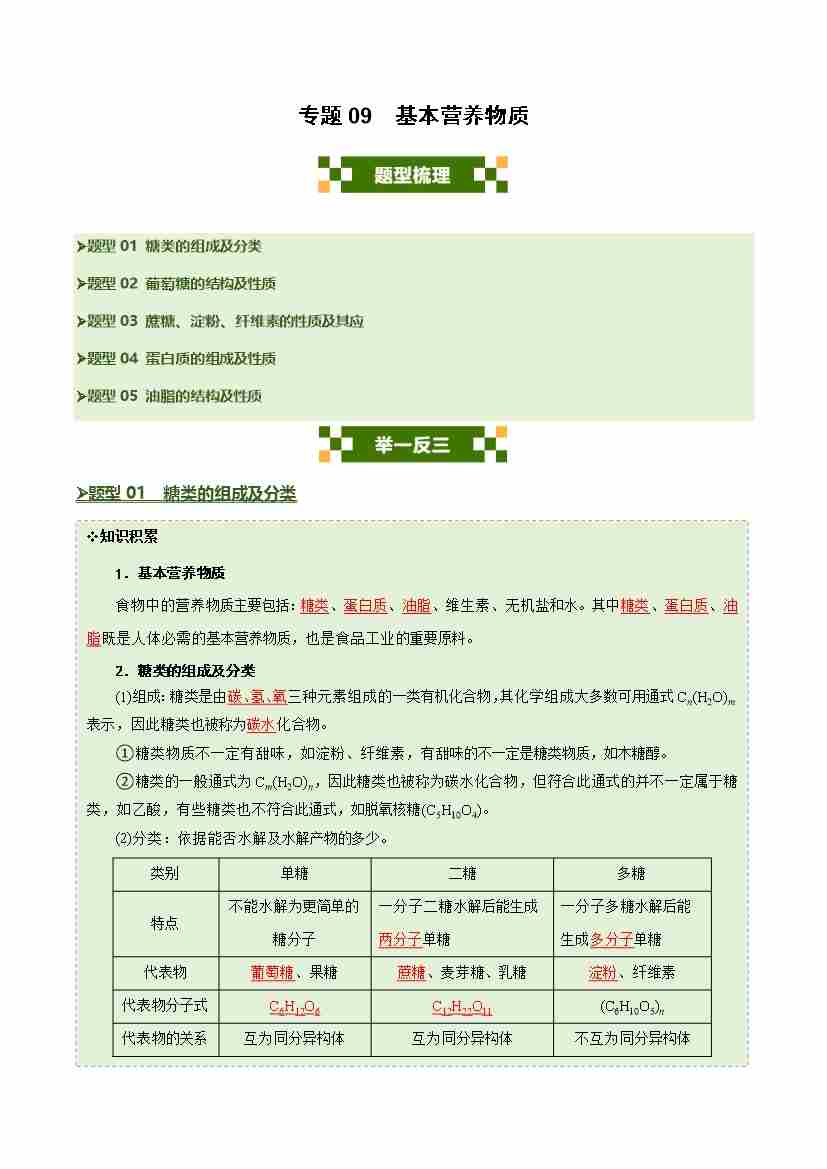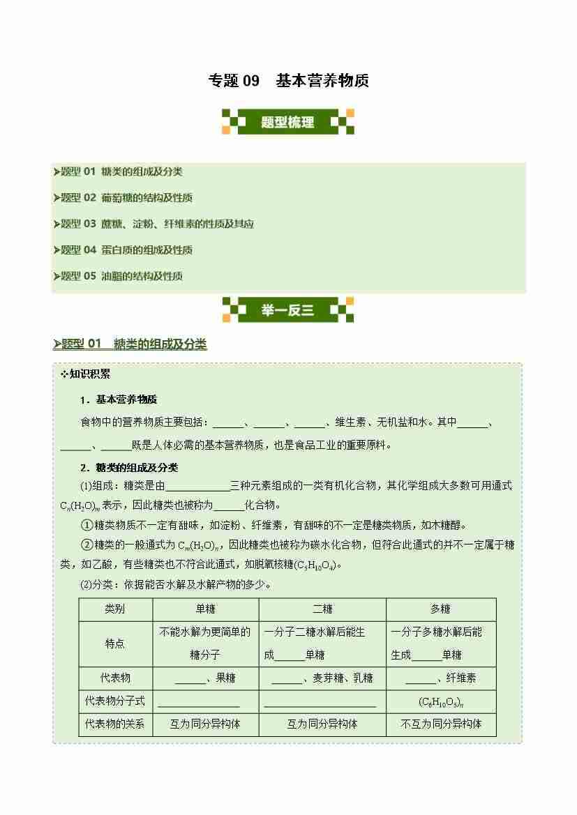 专题09 基本营养物质(五大题型)(学生版)