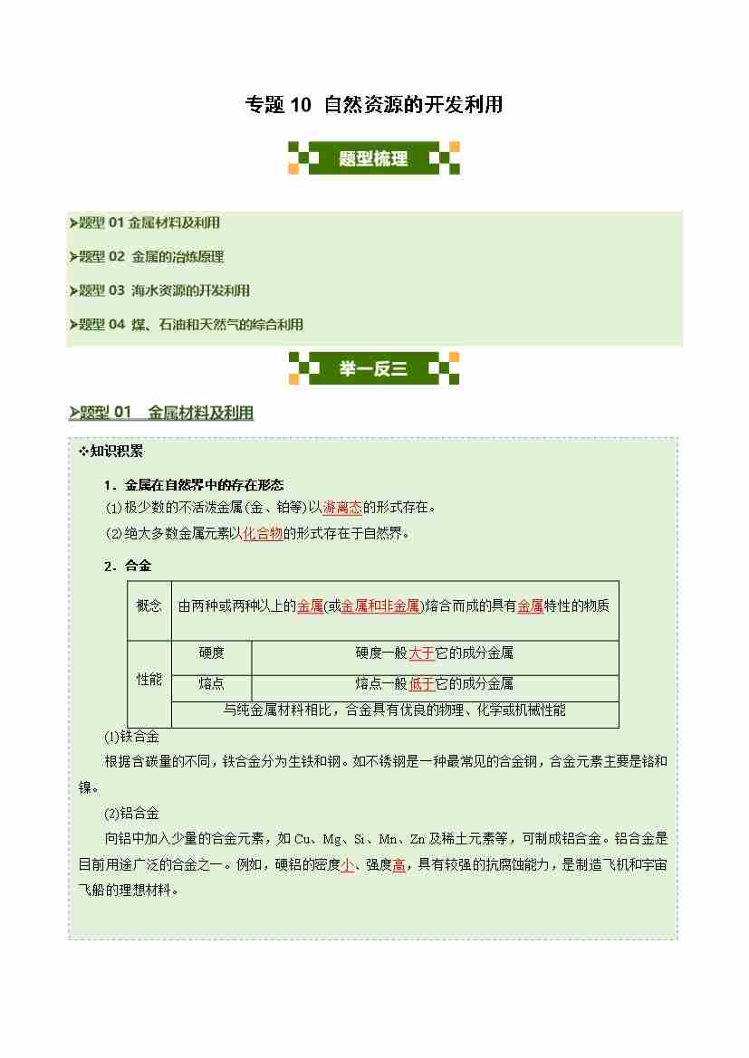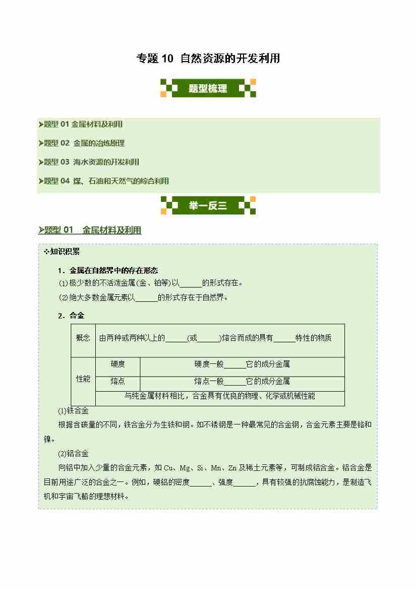 专题10 自然资源的开发利用(四大题型)(学生版)