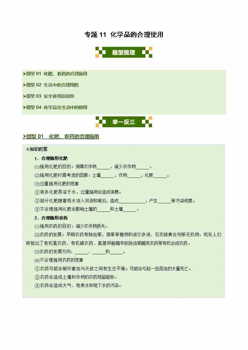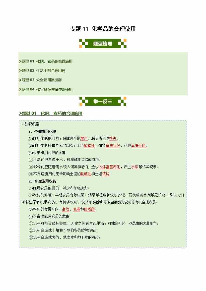 专题11 化学品的合理使用(四大题型)(学生版)