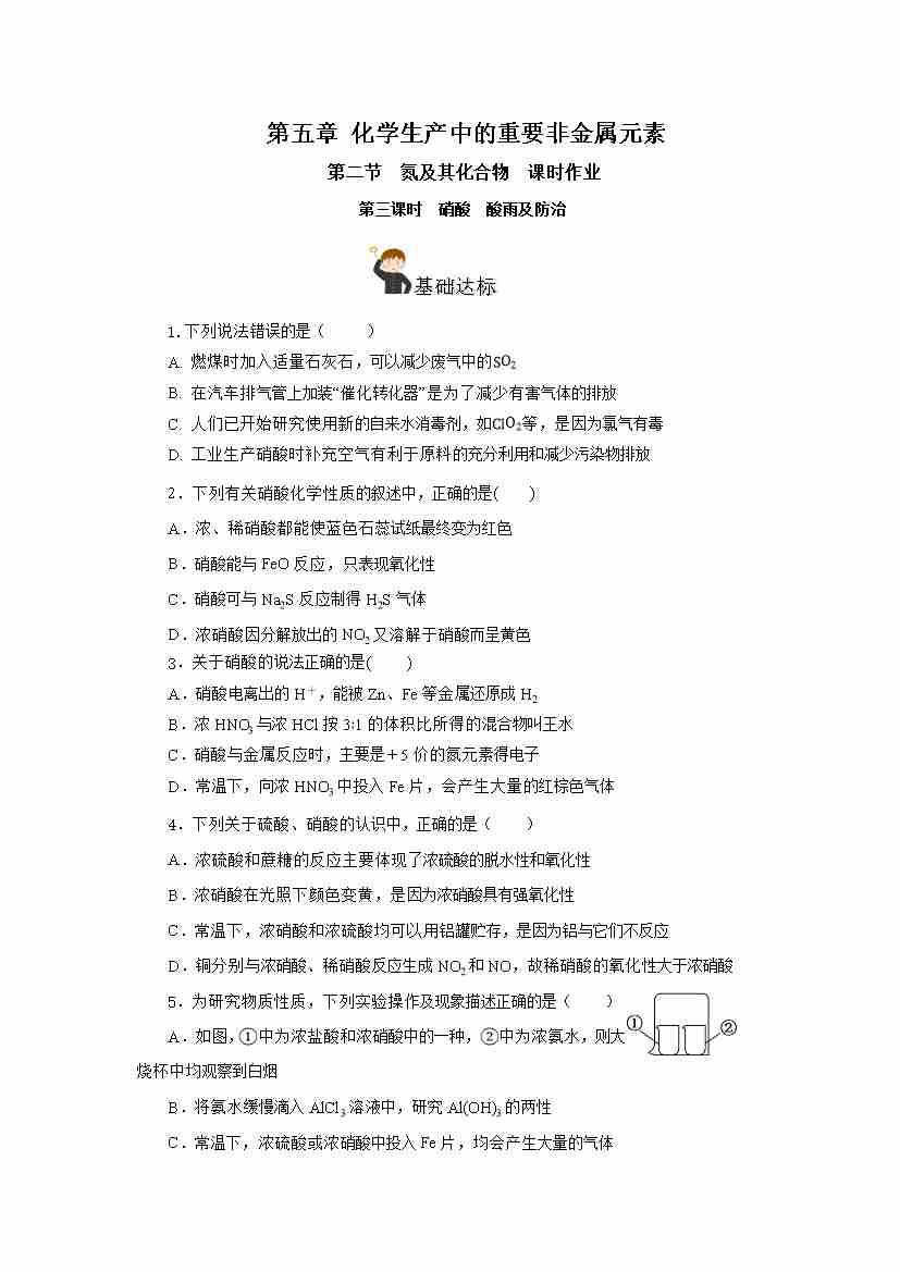 5.2.3 硝酸 酸雨及防治(分层作业)-(人教版2019必修第二册)(原卷版)
