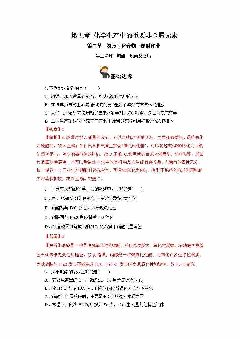 5.2.3 硝酸 酸雨及防治(分层作业)-(人教版2019必修第二册)(解析版)