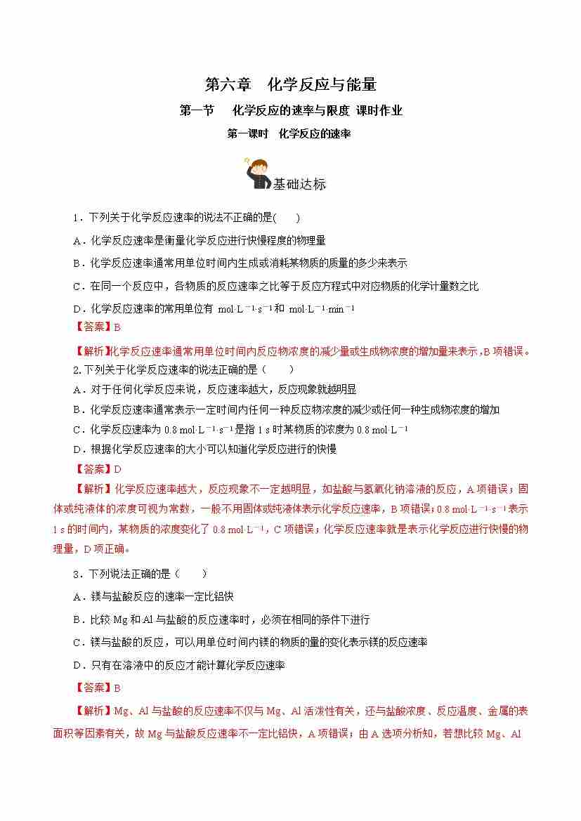 6.2.1 化学反应的速率(分层作业)(解析版)