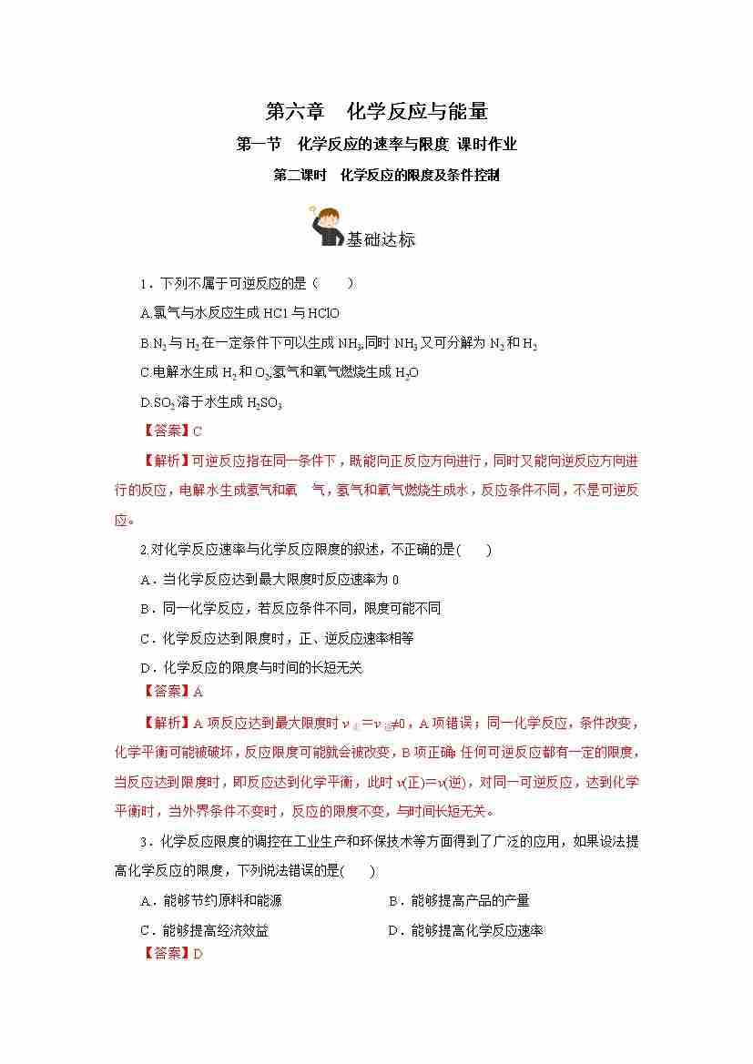 6.2.2 化学反应的限度及条件控制(分层作业)(解析版)
