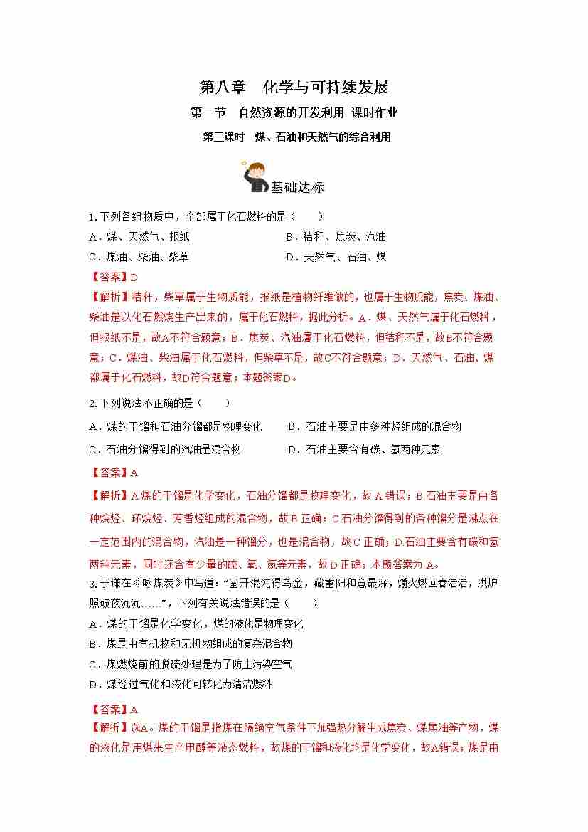 8.1.3 煤、石油和天然气的综合利用(分层作业)(解析版)