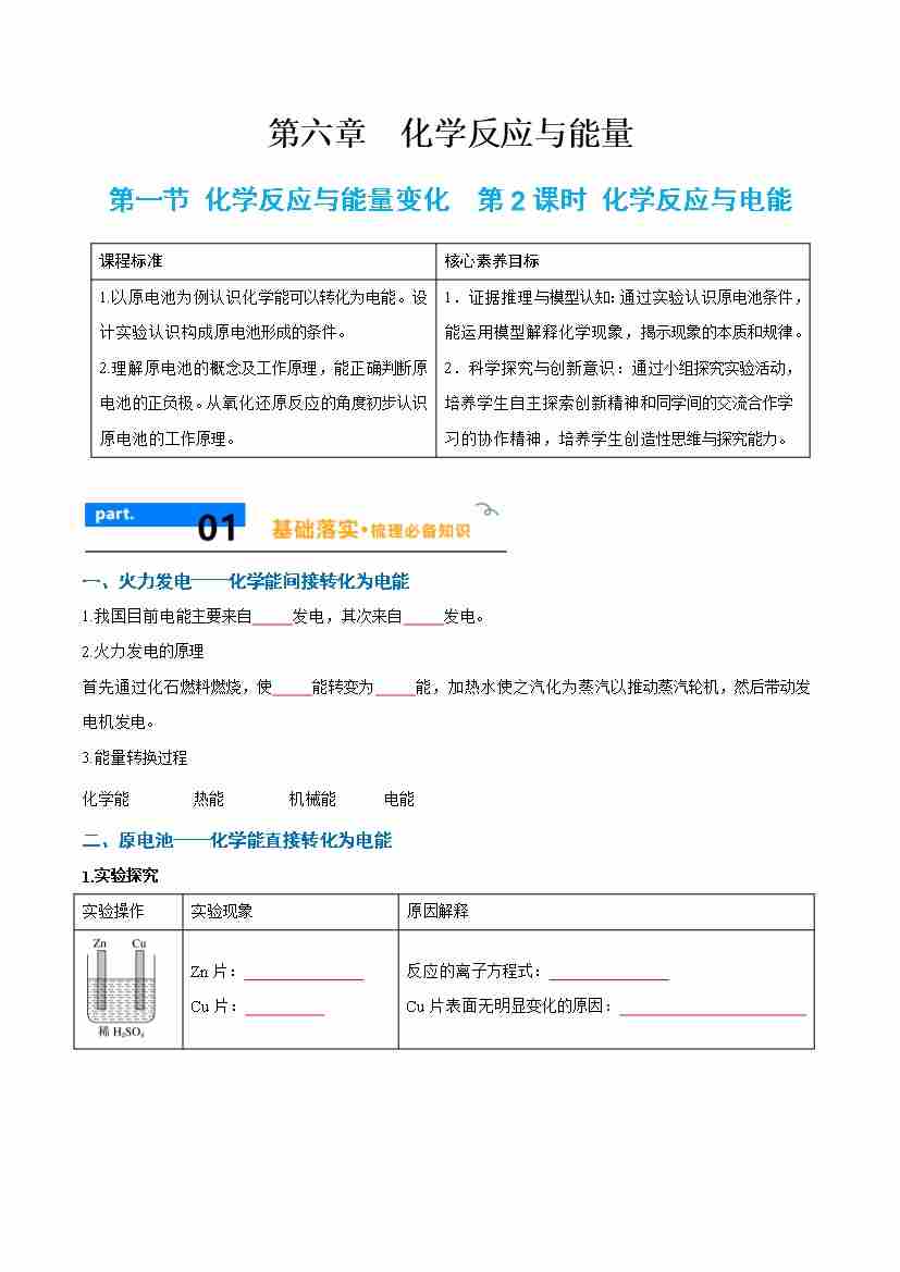6.1.2 化学反应与电能 -(人教版必修第二册)(学生版)