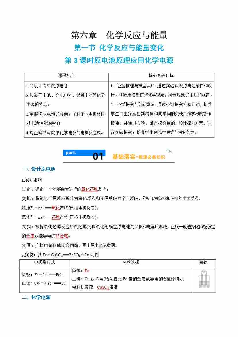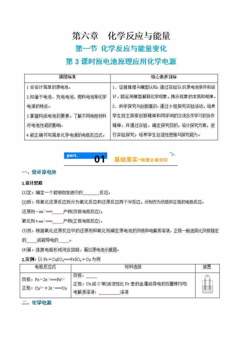 6.1.3 原电池原理应用化学电源 -(人教版必修第二册)(学生版)