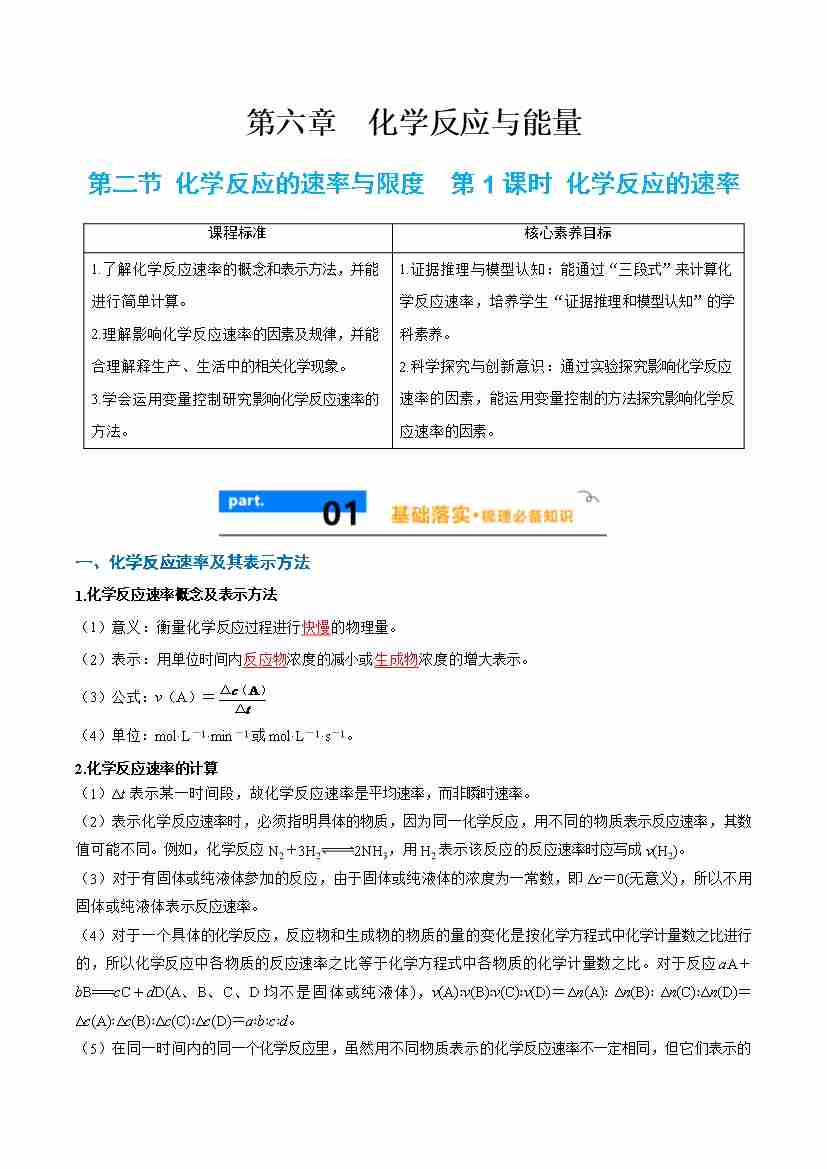 6.2.1 化学反应的速率 -(人教版必修第二册)(学生版)