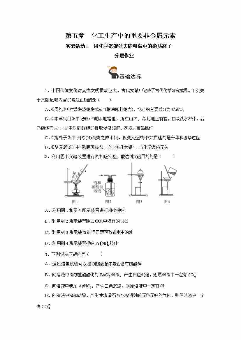 实验活动4 用化学沉淀法去除粗盐中的杂质离子(分层作业)(原卷版)