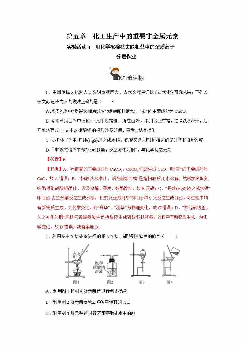 实验活动4 用化学沉淀法去除粗盐中的杂质离子(分层作业)(解析版)