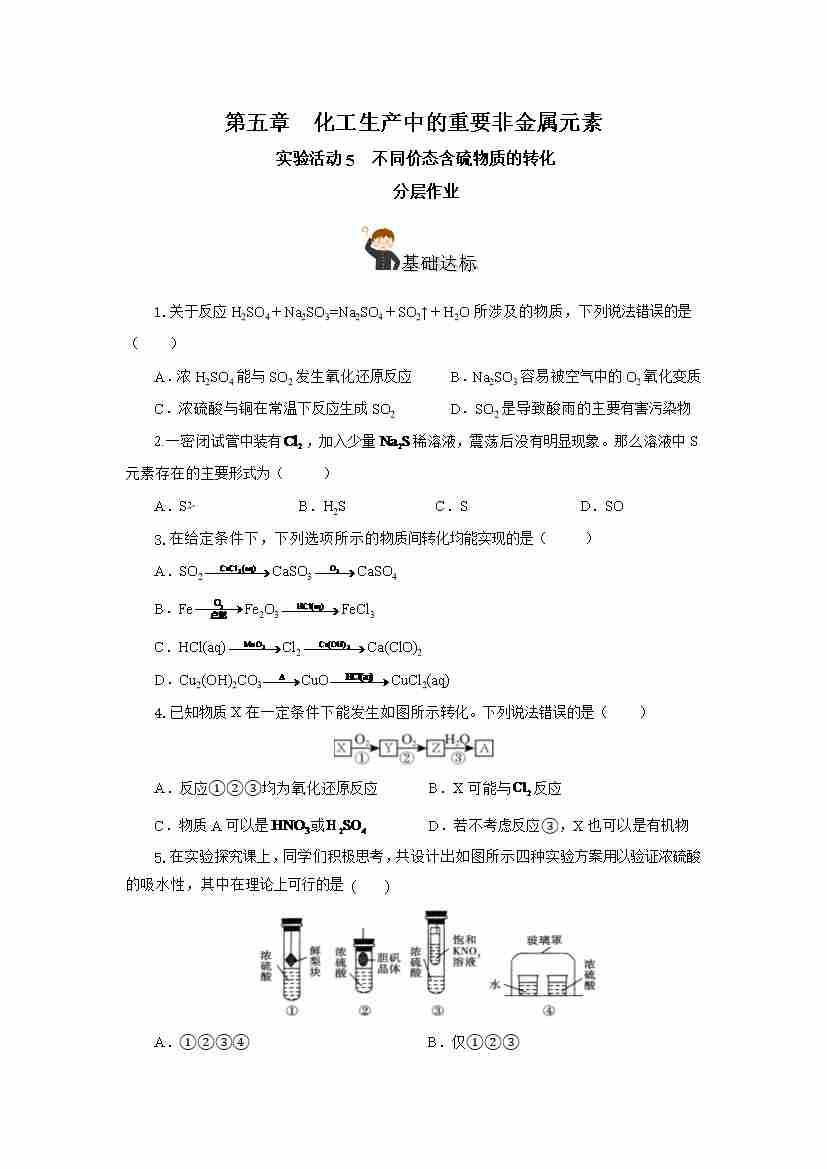 实验活动5 不同价态含硫物质的转化(分层作业)(原卷版)
