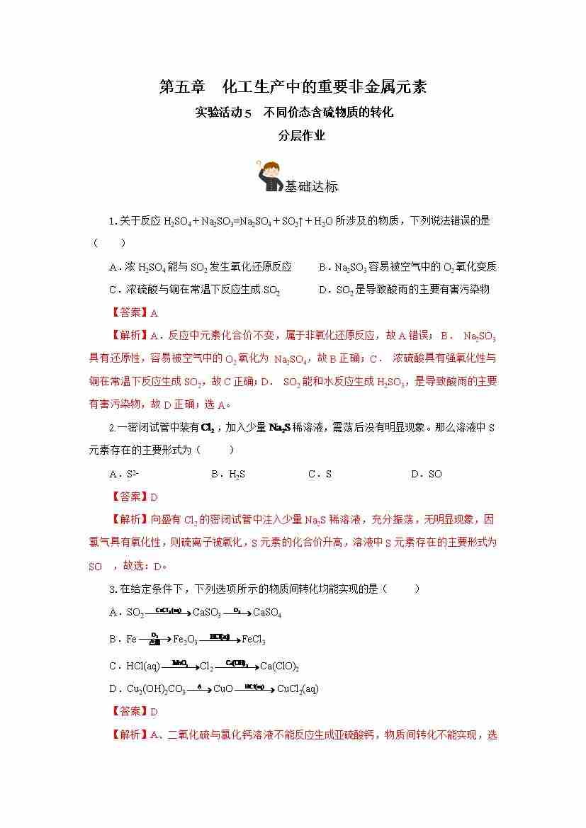 实验活动5 不同价态含硫物质的转化(分层作业)(解析版)