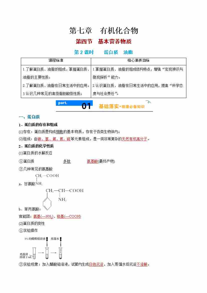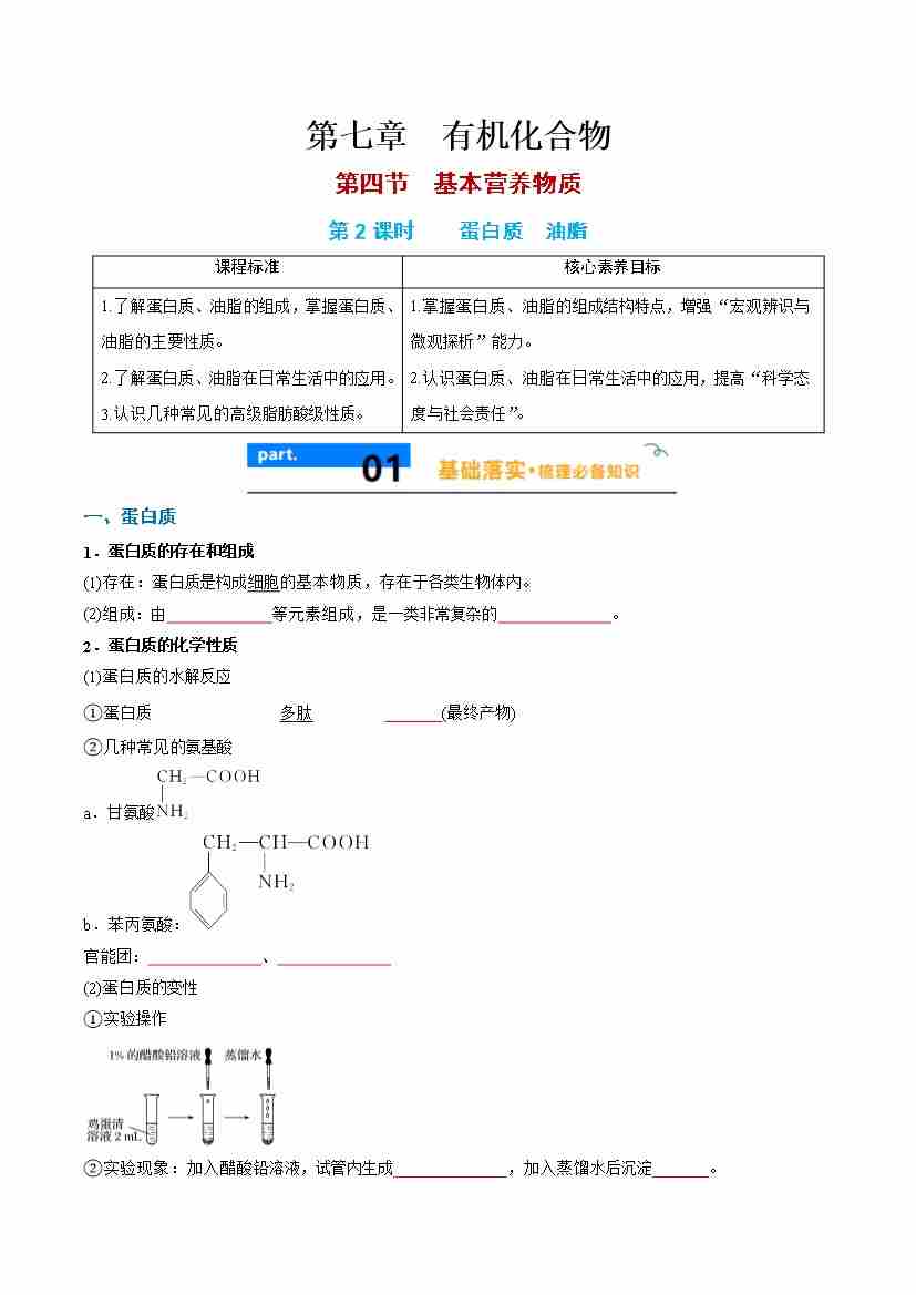 7.4.2 蛋白质 油脂 - (人教版必修第二册)(学生版)