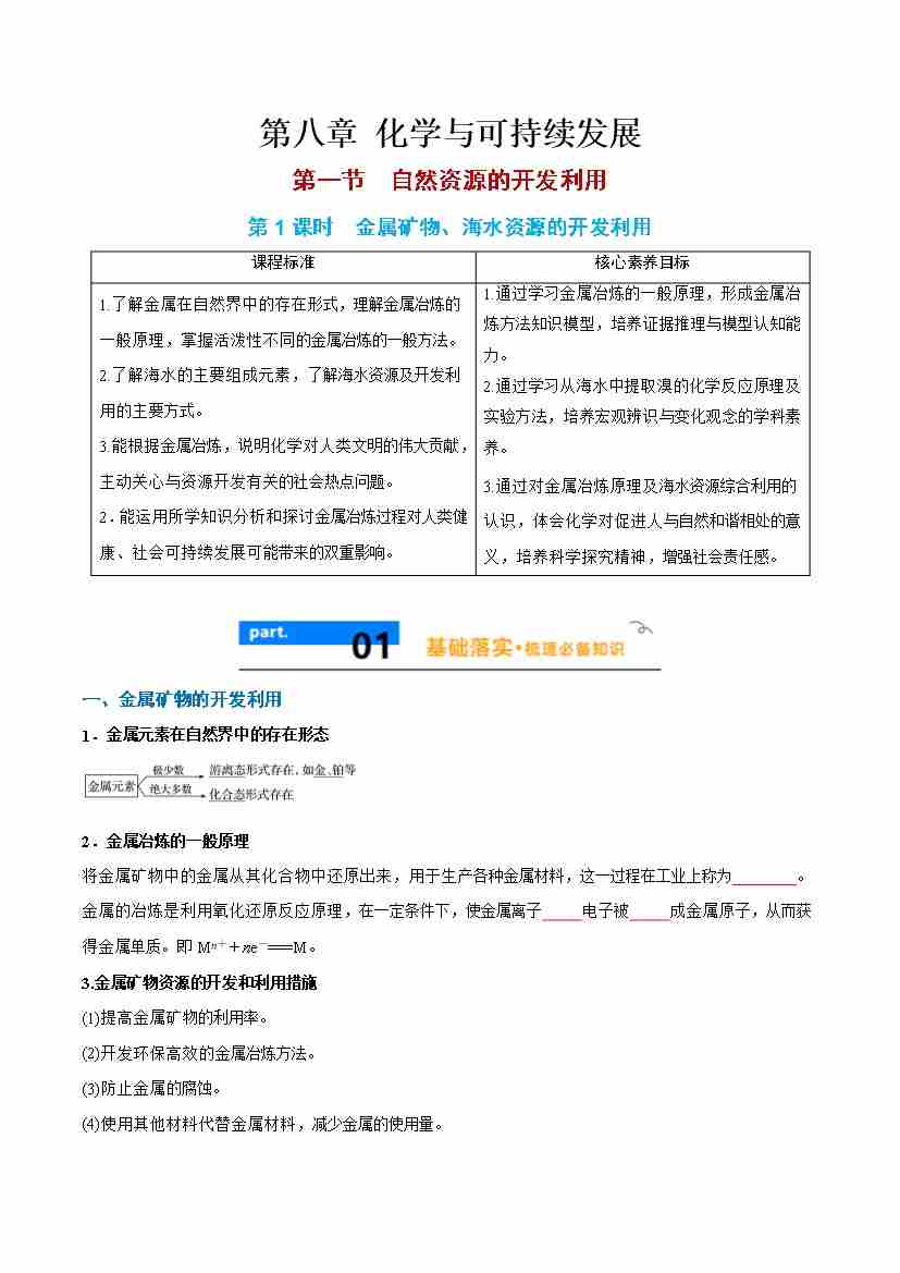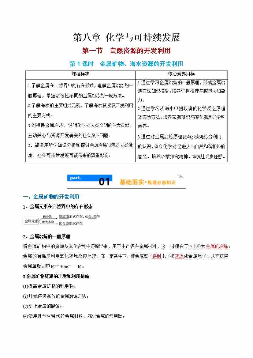 8.1.1 金属矿物、海水资源的开发利用 -(人教版必修第二册)(学生版)
