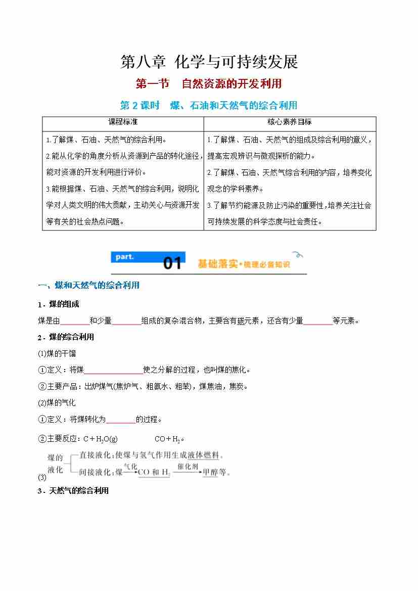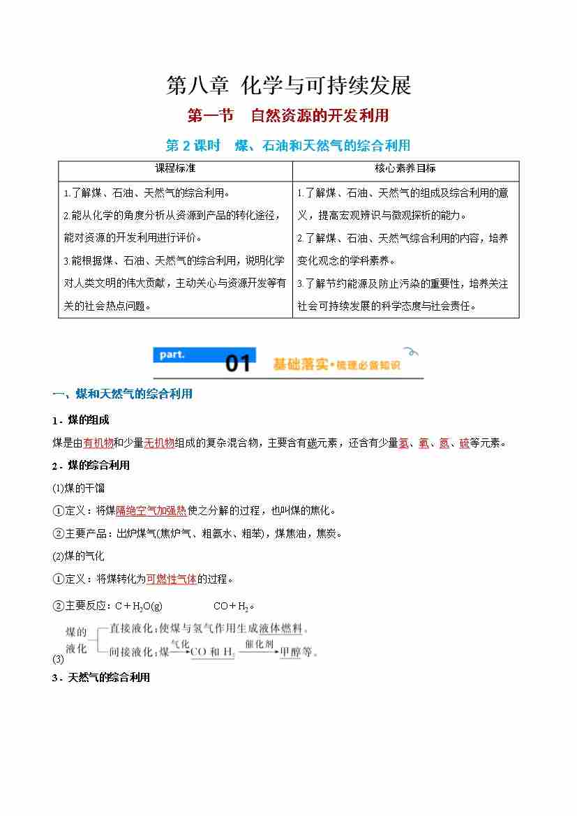 8.1.2 煤、石油和天然气的综合利用 -(人教版必修第二册)(学生版)