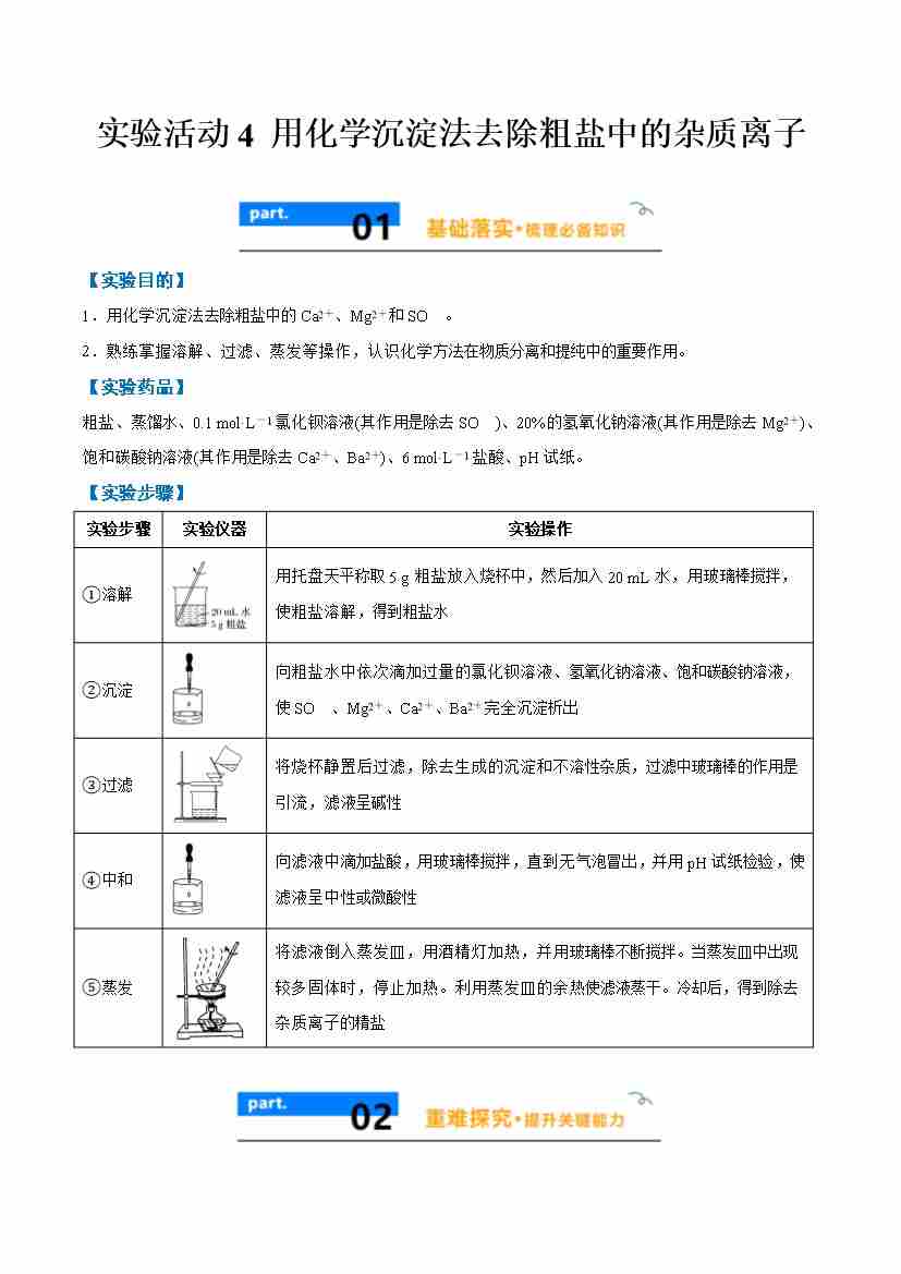 实验活动4 用化学沉淀法去除粗盐中的杂质离子 -(人教版必修第二册)(学生版)