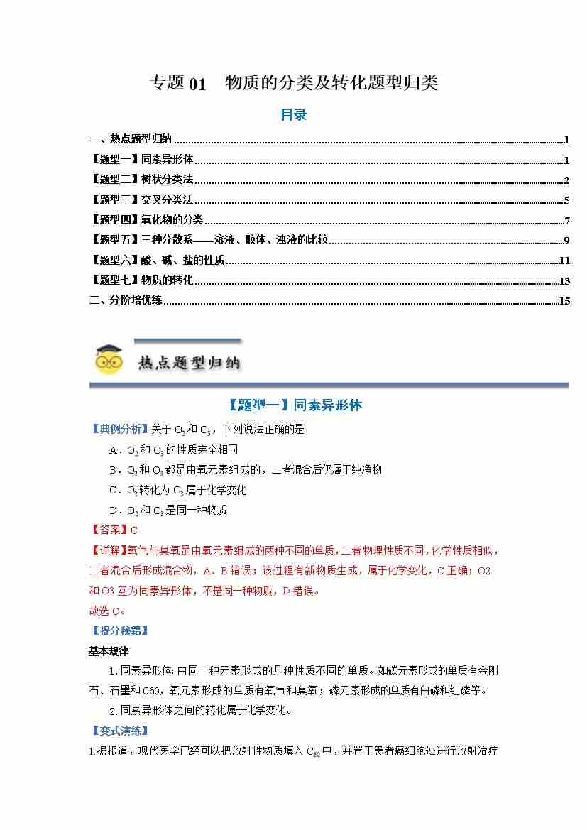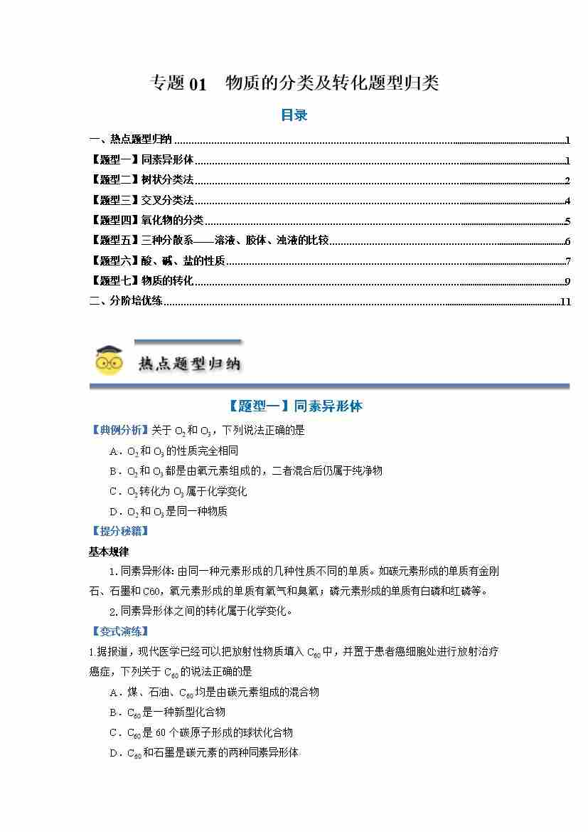 专题01 物质的分类及转化-(人教版2019必修第一册)(教师版)