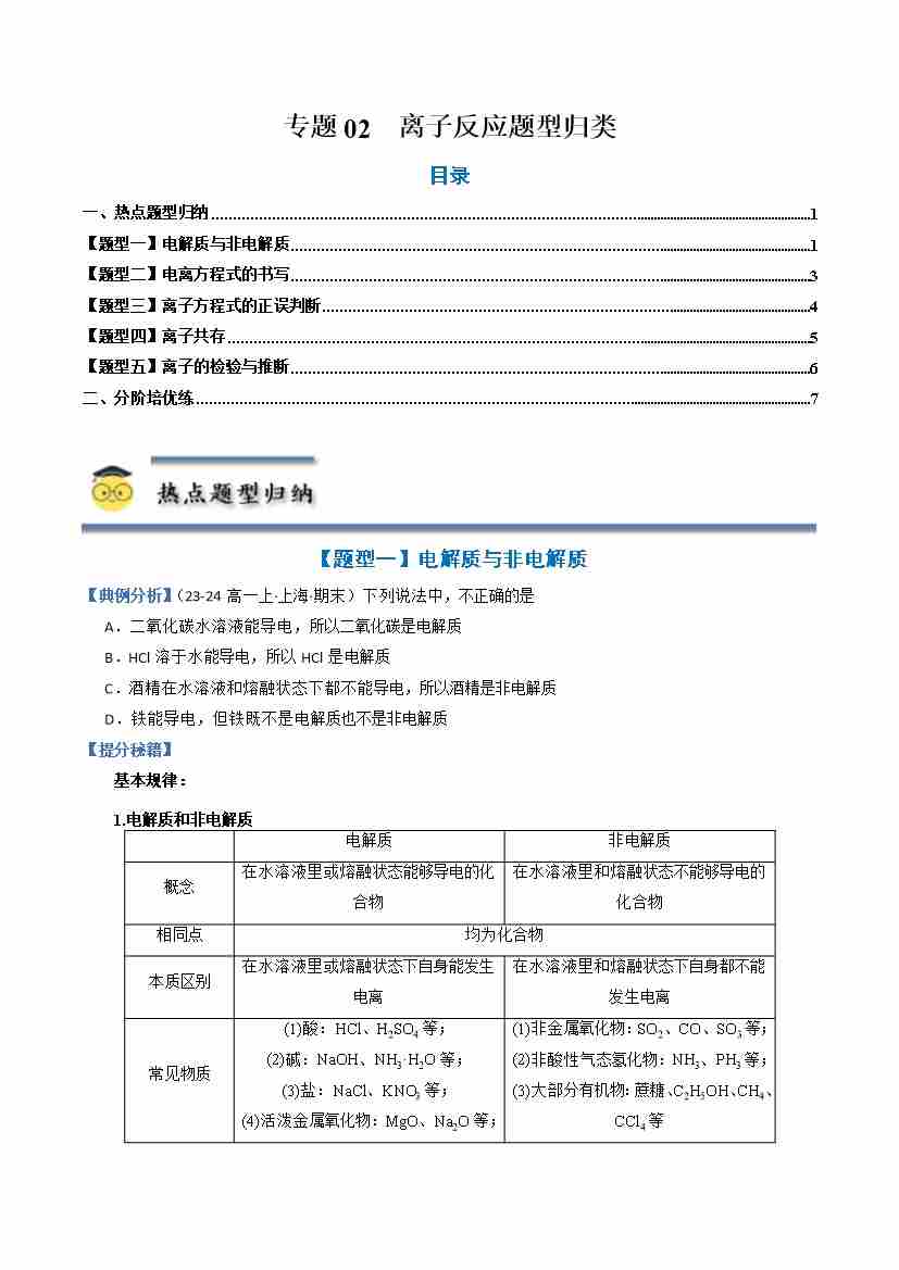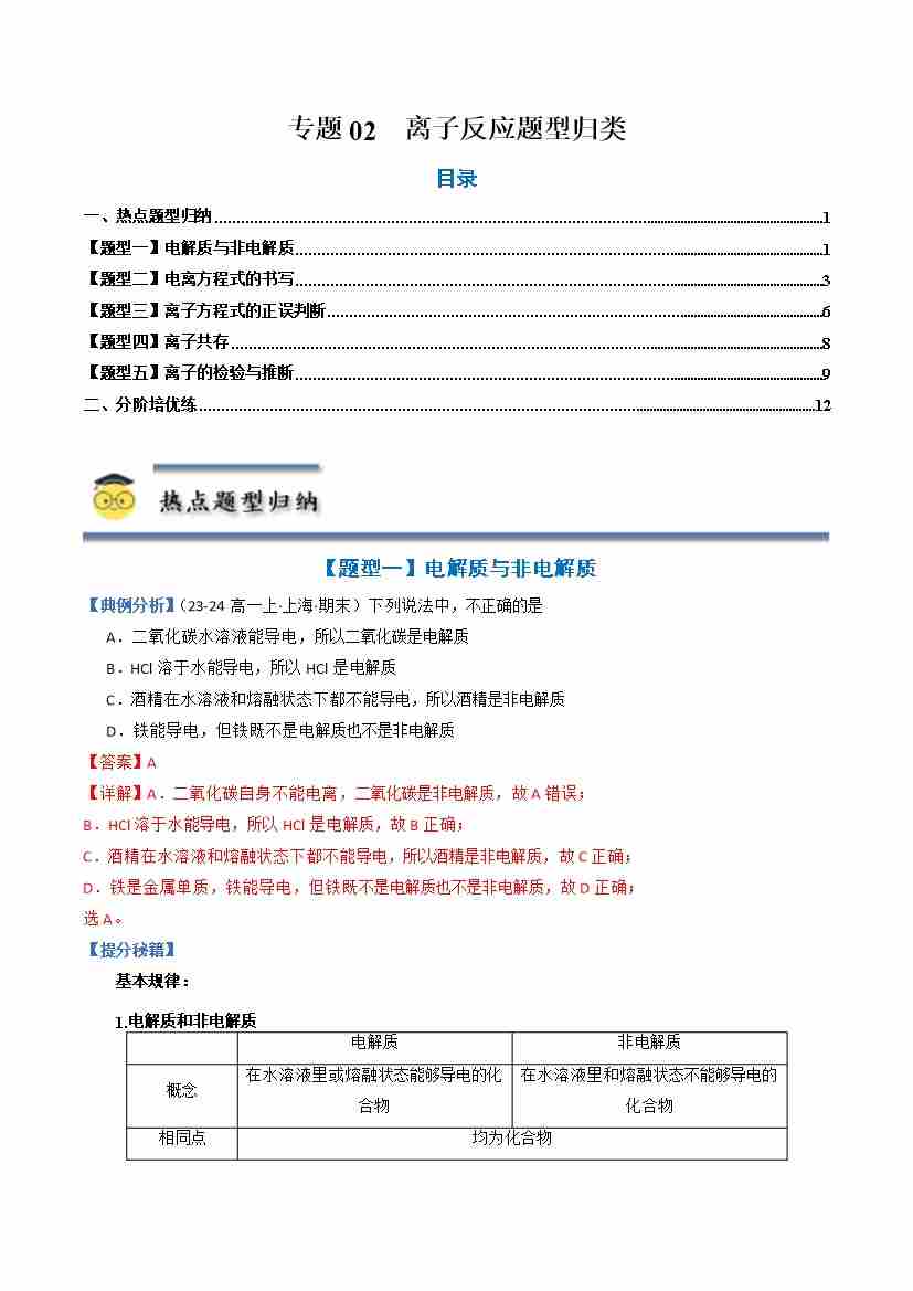 专题02 离子反应-(人教版2019必修第一册)(学生版)
