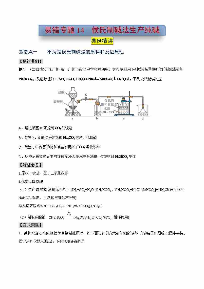 易错专题14 侯氏制碱法生产纯碱(学生版)