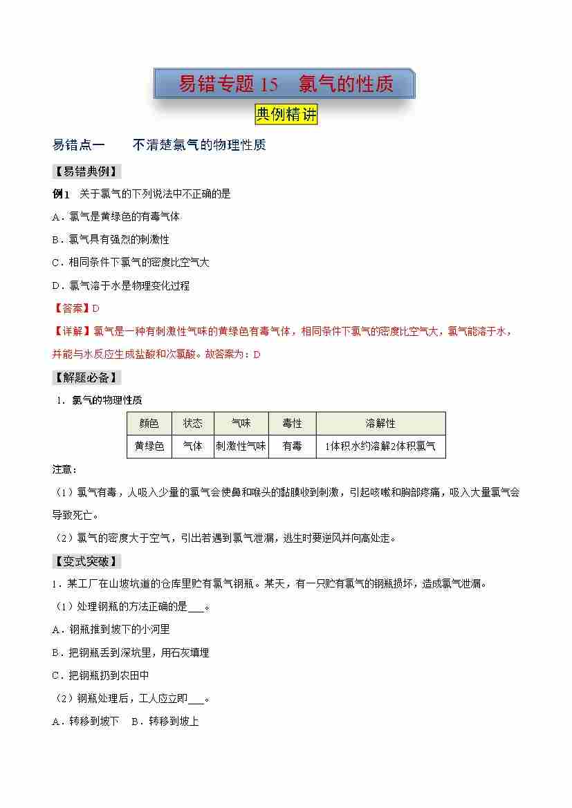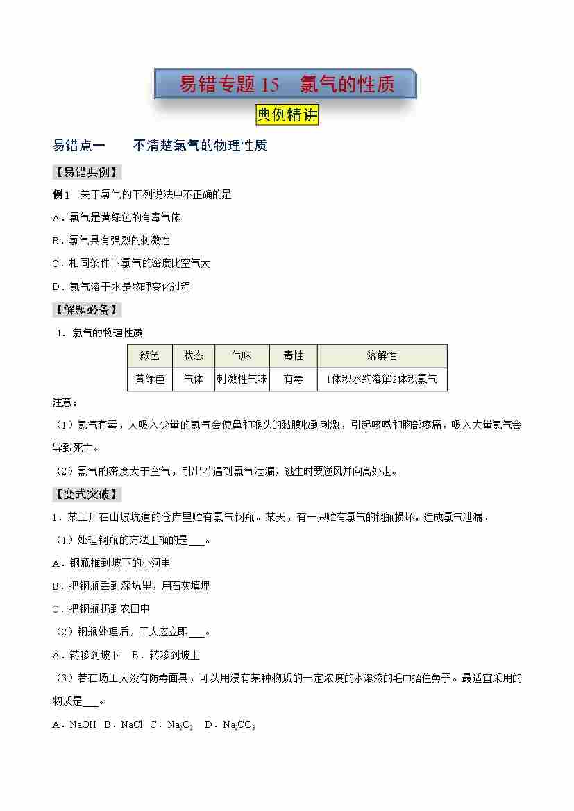 易错专题15 氯气的性质(学生版)