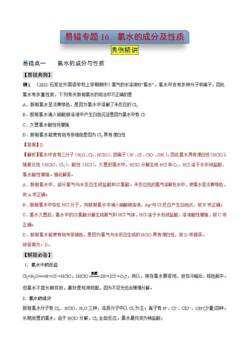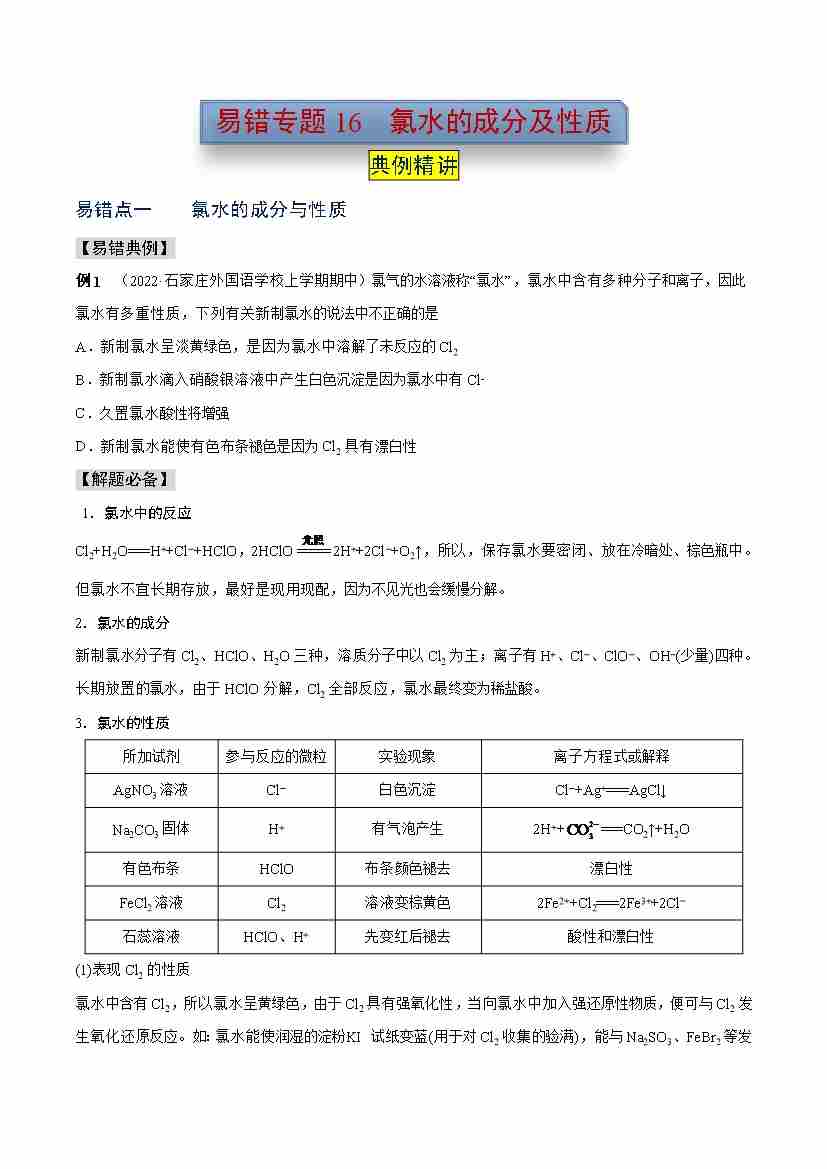 易错专题16 氯水的成分及性质(学生版)