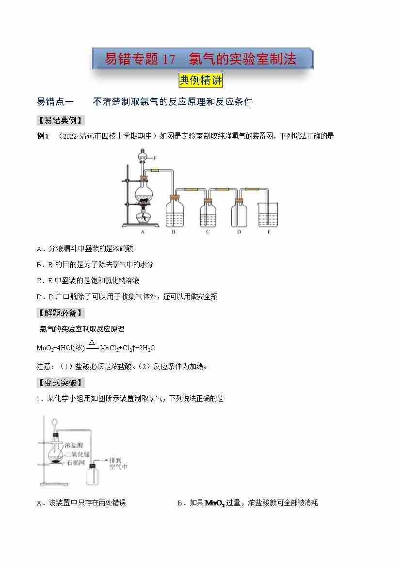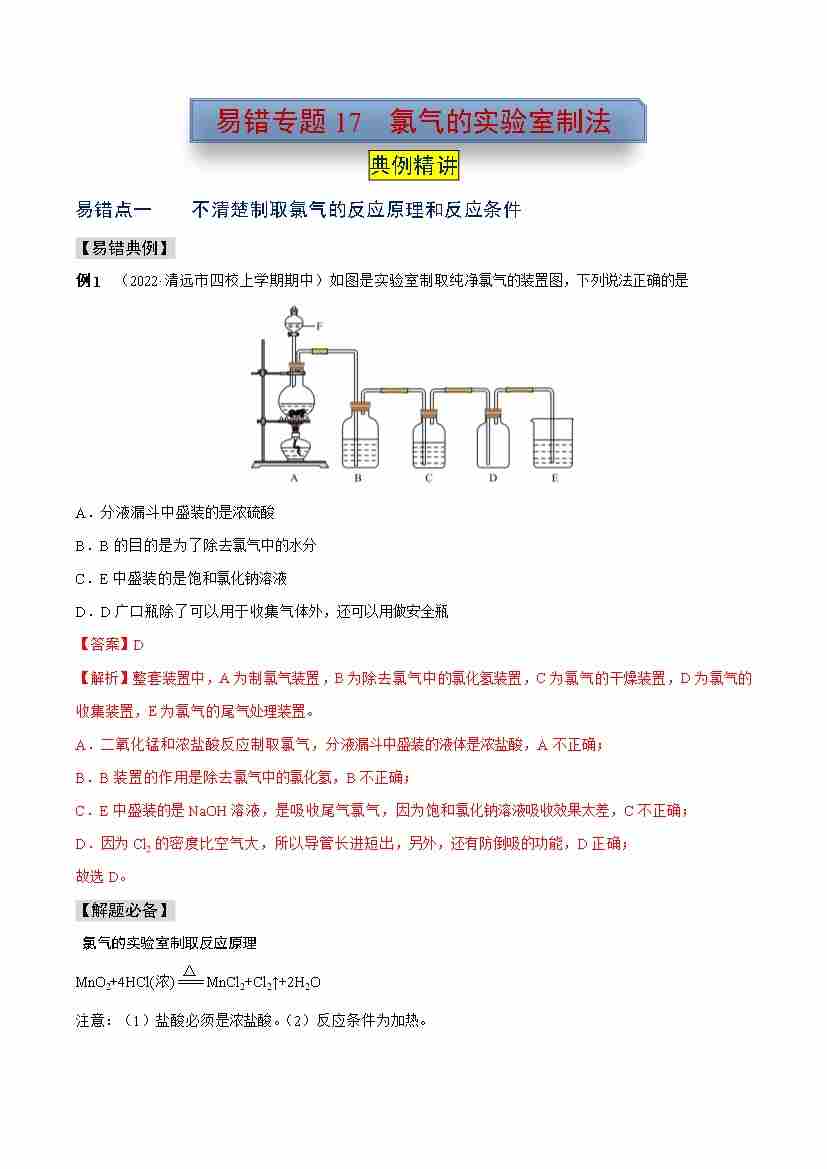 易错专题17 氯气的实验室制法(学生版)