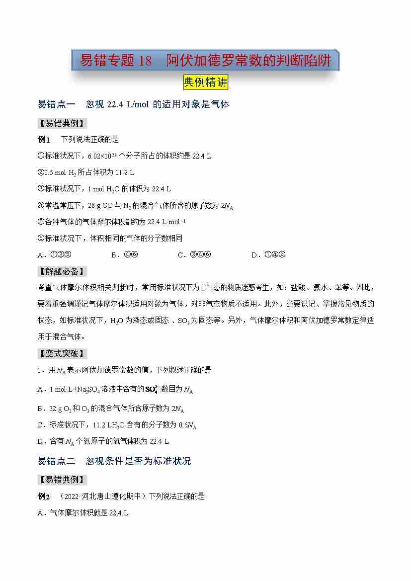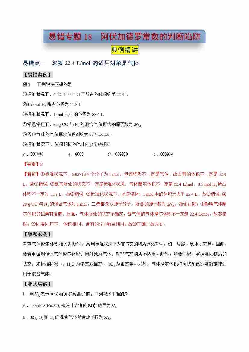 易错专题18 阿伏加德罗常数的判断陷阱(教师版)