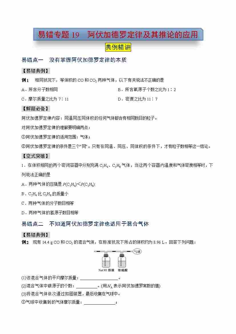 易错专题19 阿伏加德罗定律及其推论的应用(学生版)