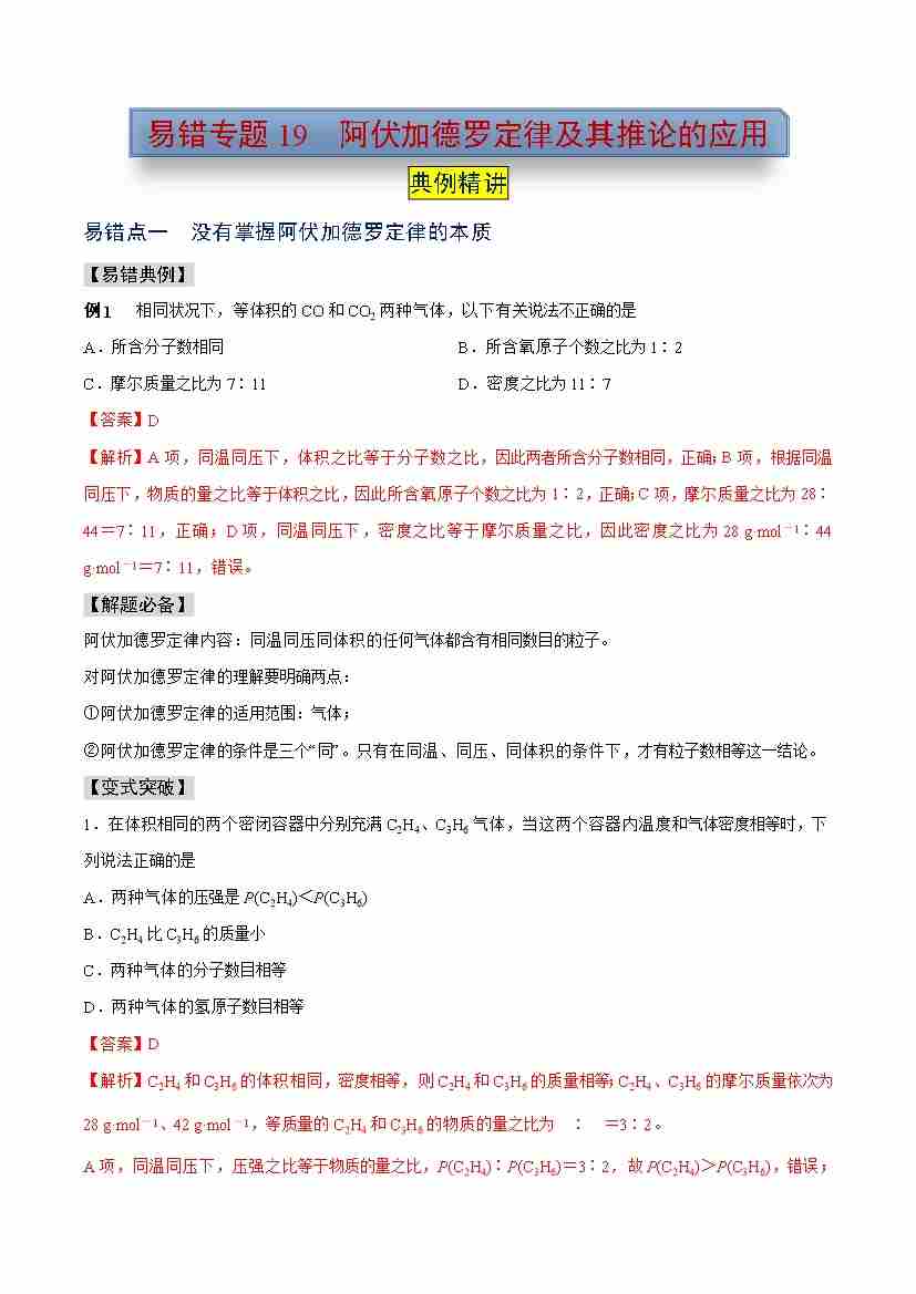易错专题19 阿伏加德罗定律及其推论的应用(教师版)