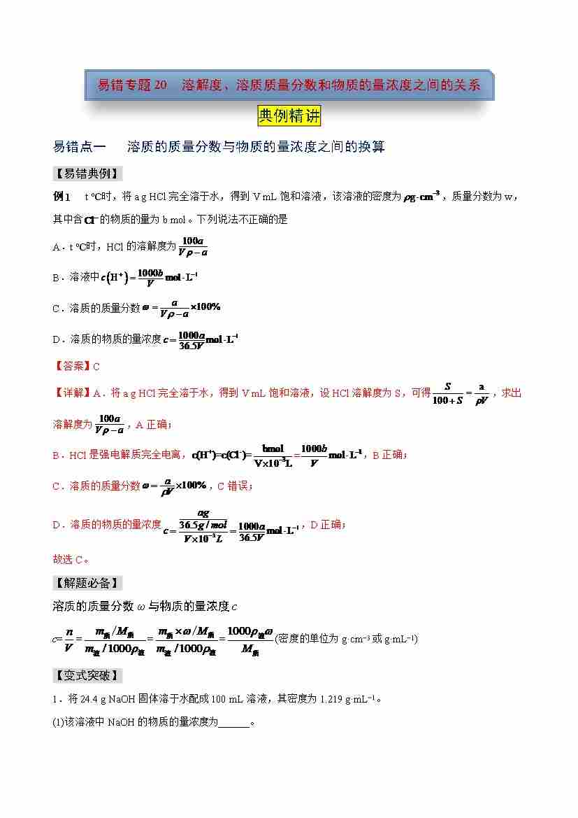 易错专题20 溶解度、溶质质量分数和物质的量浓度之间的关系(学生版)