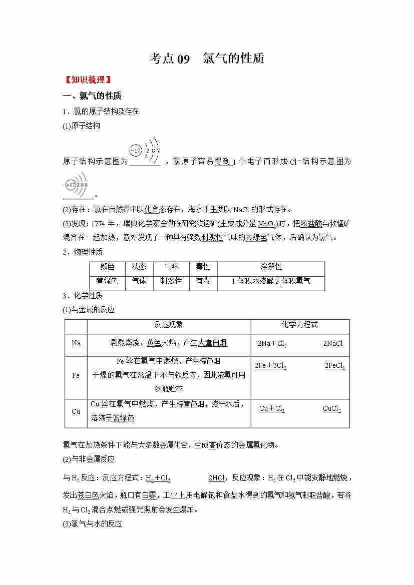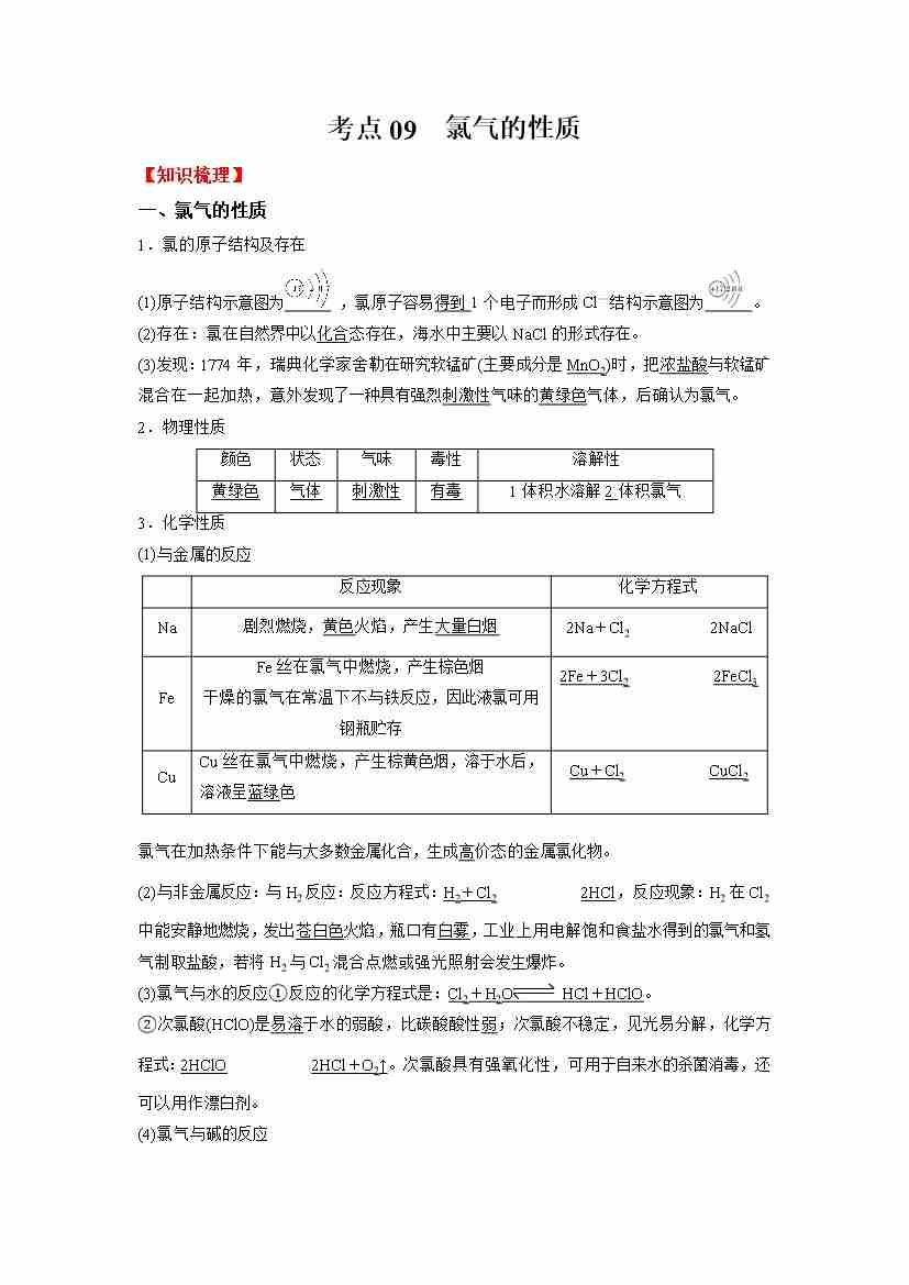 考点09 氯气的性质(学生版)