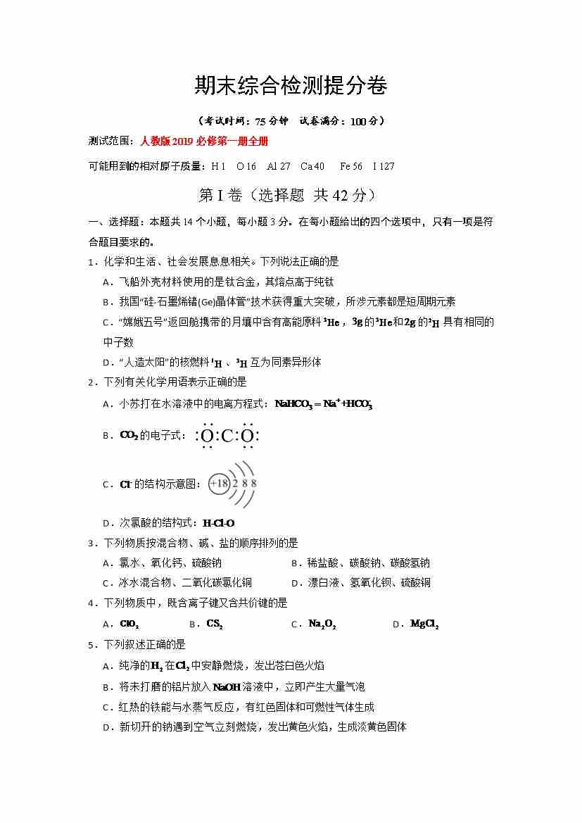 期末综合检测提分卷(测试范围:第1章至第4章)-(人教版2019必修第一册)(学生版)